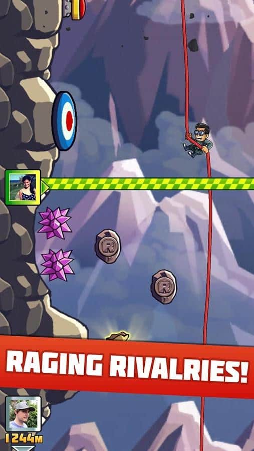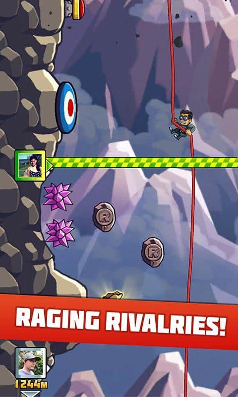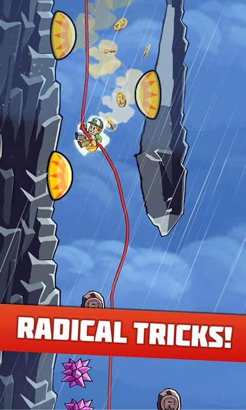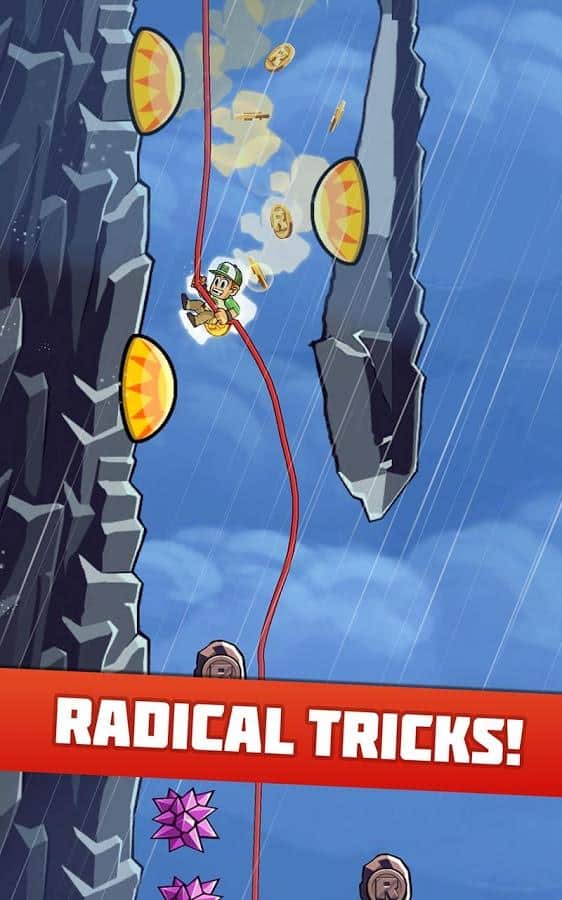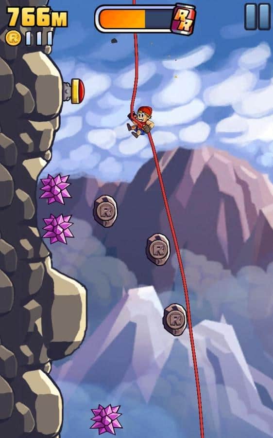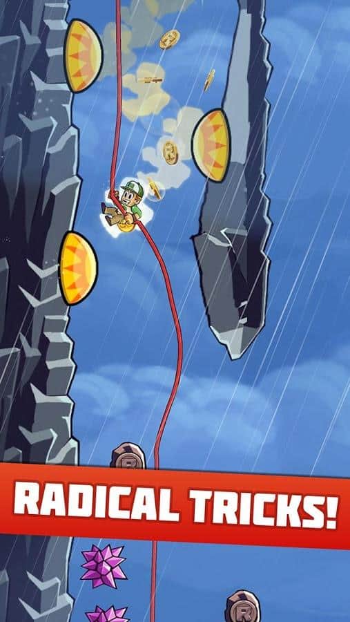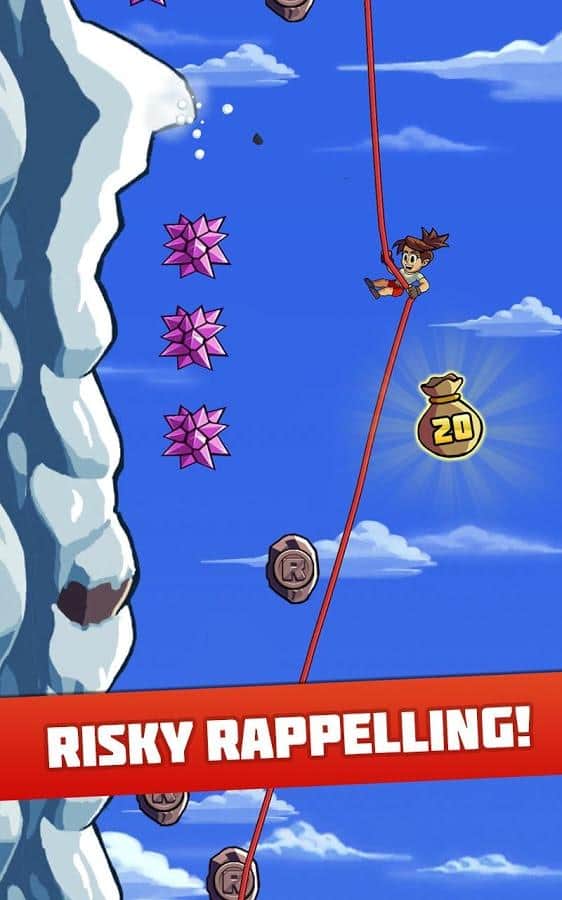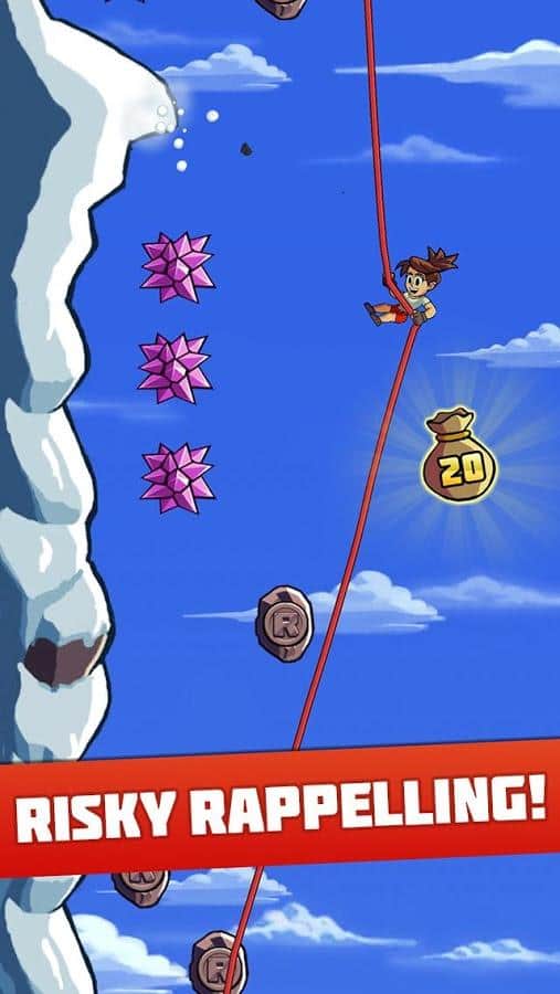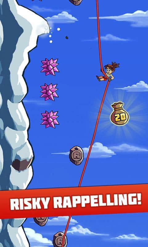 Radical Rappelling – аркада в которой вы будете управлять альпинистом, спускающимся с высокой горы. Выбирайте себе подходящего героя, каждый из них обладает своими уникальными способностями и возможностями, прыгайте со сколы и спускайтесь на тросе, преодолевая все препятствия и собирая золотые монетки. Эта игра разработана для любителей острых ощущений и адреналина. Спускайтесь с горы и совершайте опасные трюки, получая за них дополнительные бонусы. Все уровни в этой игре рандомные и меняются в зависимости от выбранного персонажа. Соревнуйтесь со своими друзьями и получайте максимум острых ощущений от игры.