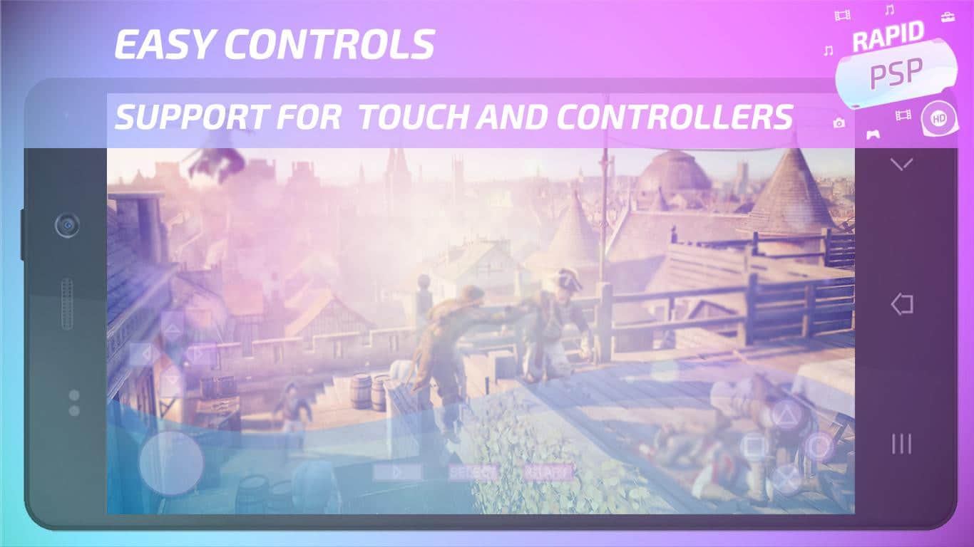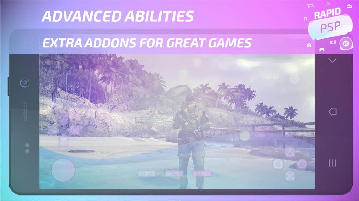 Rapid PSP Emulator может эмулировать и запускать любую игру для PSP, которую вы пожелаете. Простоя настройка игрового контроллера, качество изображения, звук и конечно же максимальная совместимость с играми для PSP.