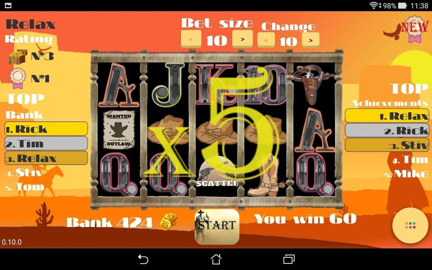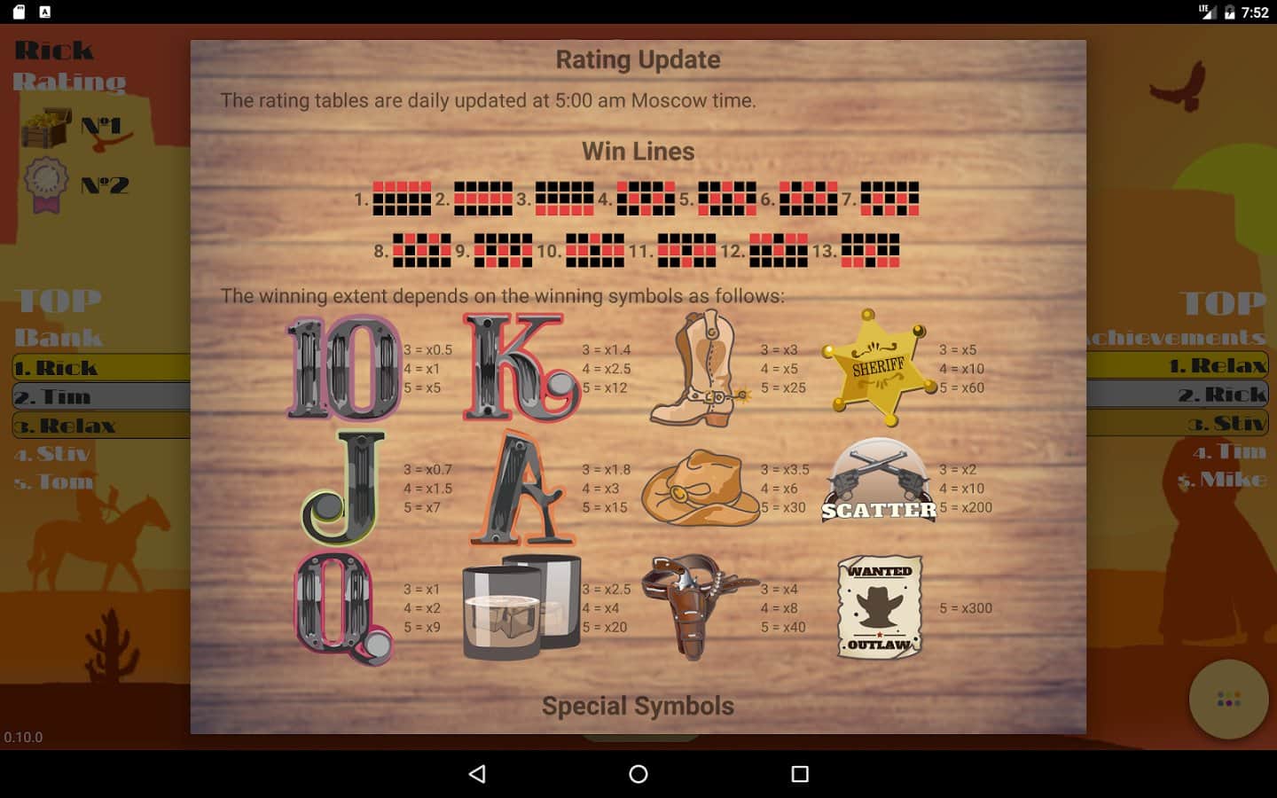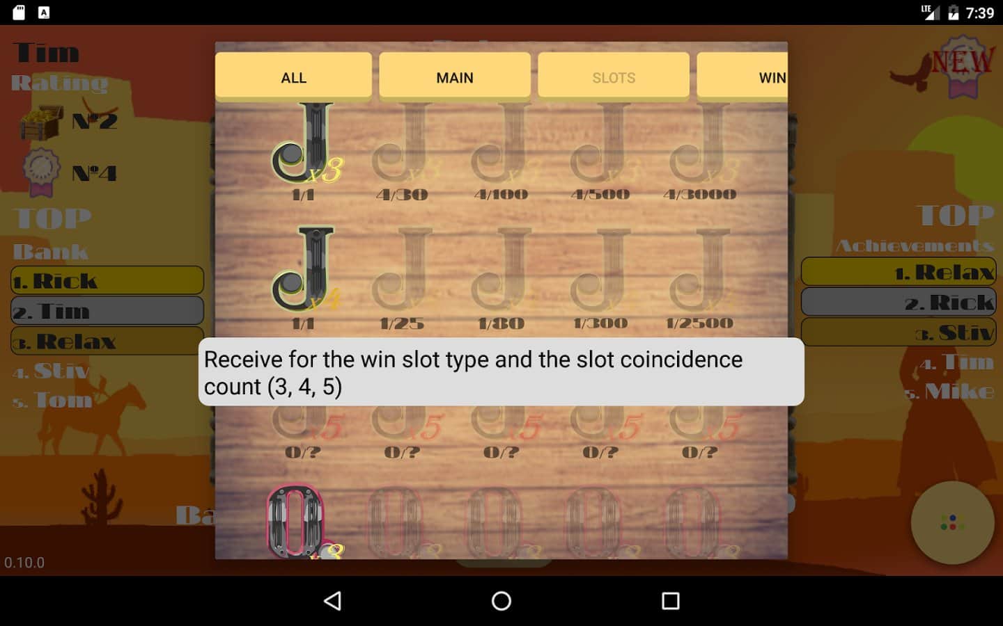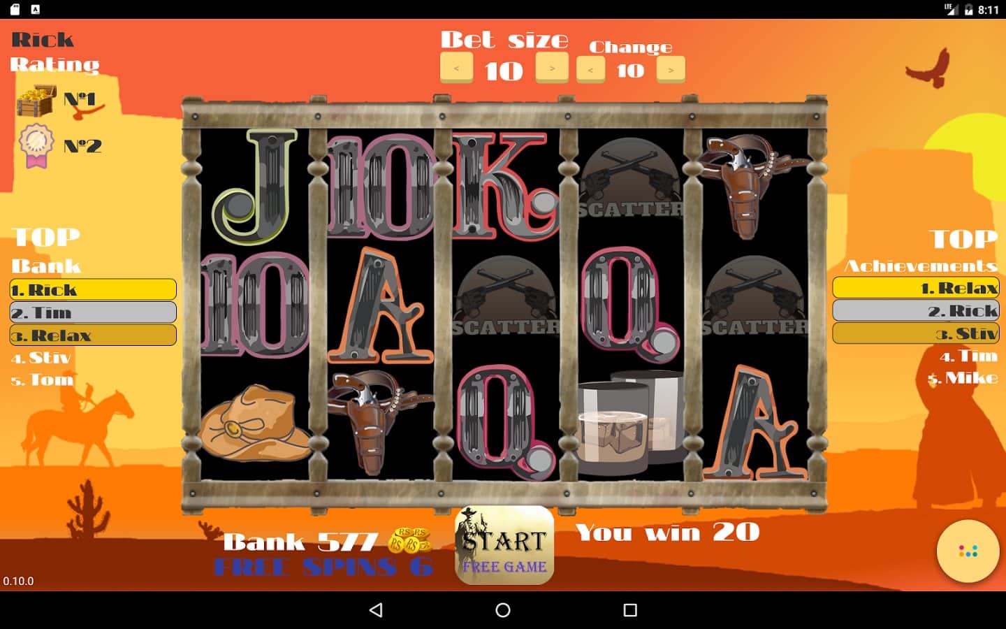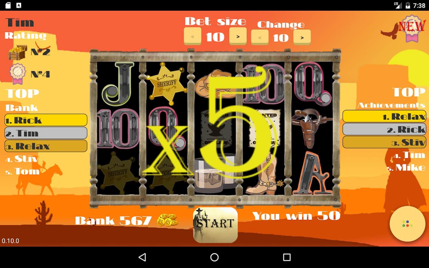 Rating Slots – слот-машина на андроид, где вы сможете на деле проверить свою удачу. Эта игра выполнена в стиле Дикого Запада, где вашей главной задачей будет набрать максимальное количество монет и достижений. Делайте свои ставки и запускайте в работу слот-машину, наблюдая за тем как крутятся барабаны и выстраиваются в линии выигрыша. Всего в игре представлено 13 выигрышных линий, заполучите их все. Поднимайтесь все выше в таблице лидеров и занимайте в ней лидирующие места, соревнуясь с друзьями и другими игроками со всего мира. Каждый день таблица рейтингов будет обновляться, так что не упустите свою возможность. Активируйте супер-игру и соберите все монеты и достижения.