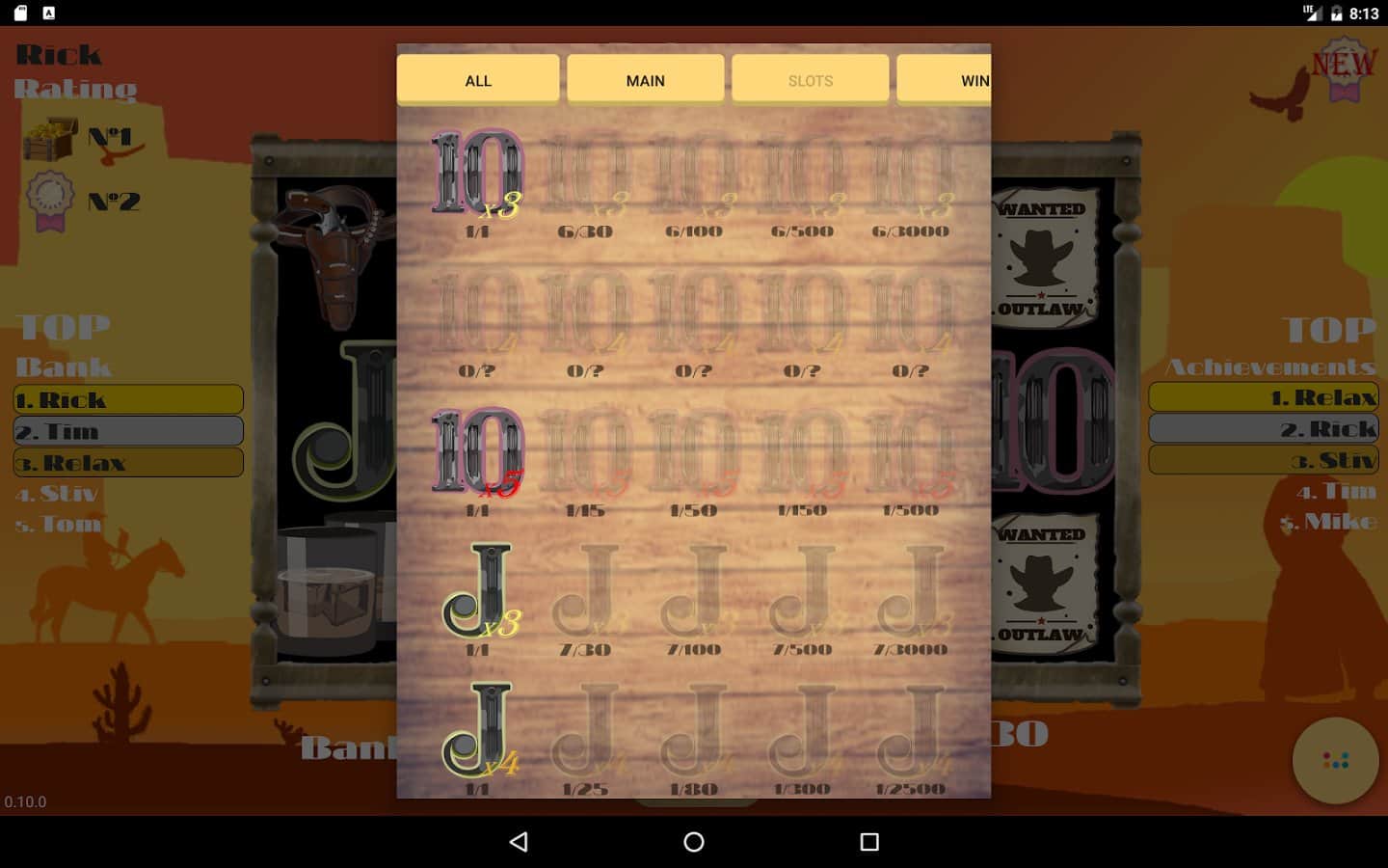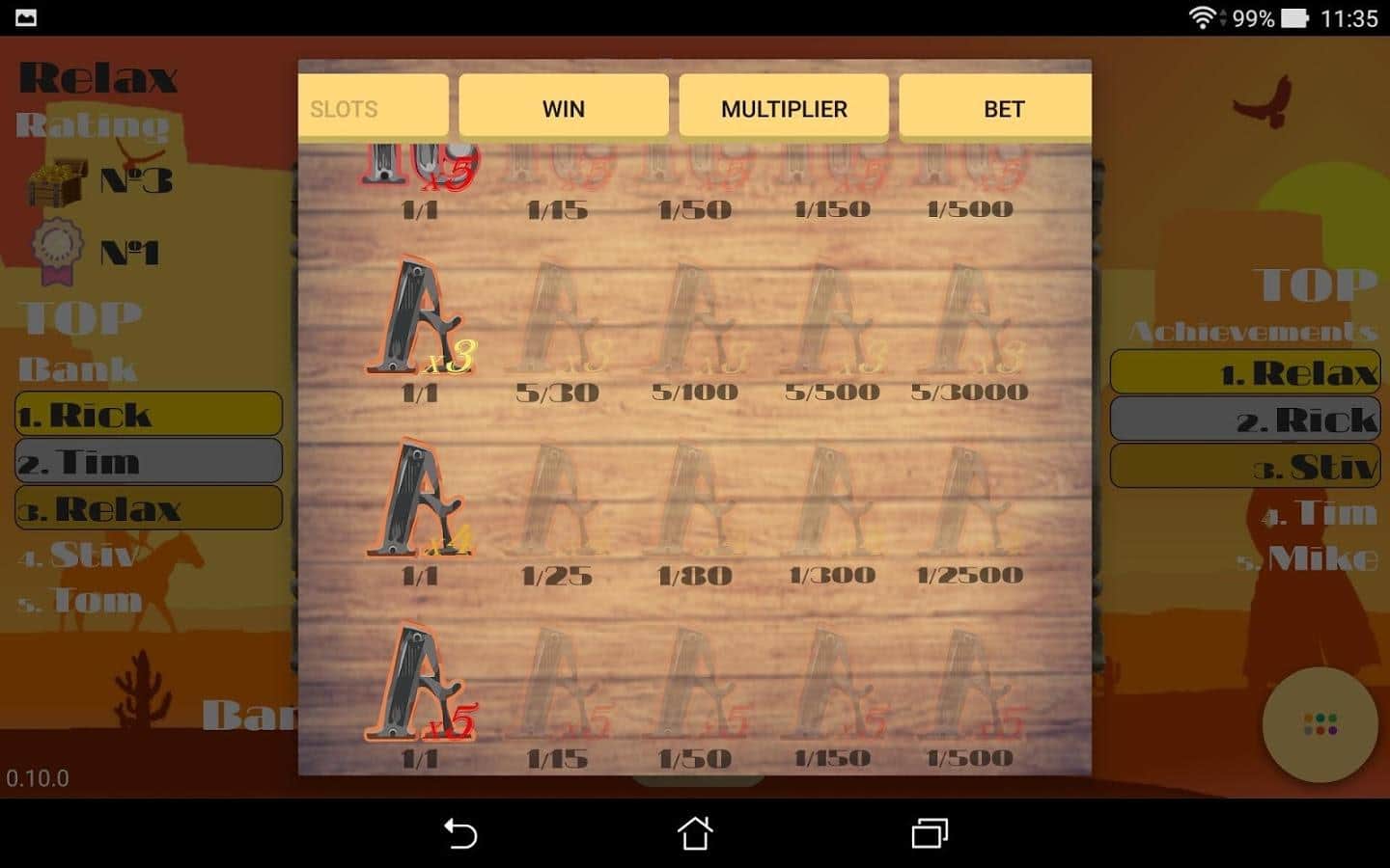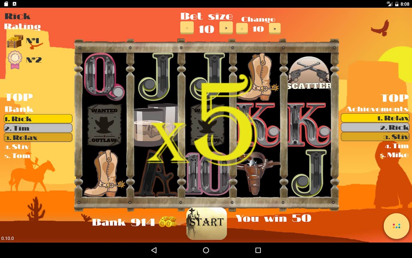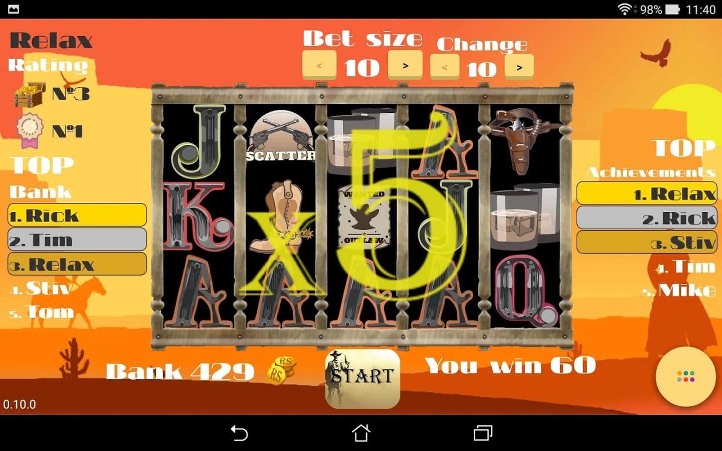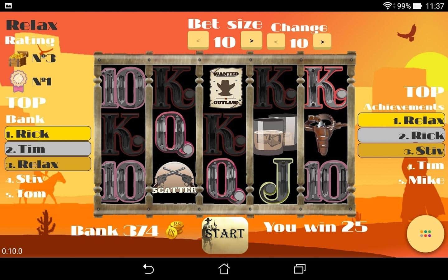 Rating Slots – слот-машина на андроид, где вы сможете на деле проверить свою удачу. Эта игра выполнена в стиле Дикого Запада, где вашей главной задачей будет набрать максимальное количество монет и достижений. Делайте свои ставки и запускайте в работу слот-машину, наблюдая за тем как крутятся барабаны и выстраиваются в линии выигрыша. Всего в игре представлено 13 выигрышных линий, заполучите их все. Поднимайтесь все выше в таблице лидеров и занимайте в ней лидирующие места, соревнуясь с друзьями и другими игроками со всего мира. Каждый день таблица рейтингов будет обновляться, так что не упустите свою возможность. Активируйте супер-игру и соберите все монеты и достижения.