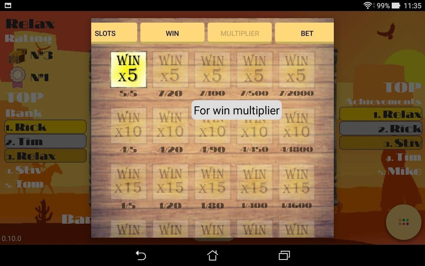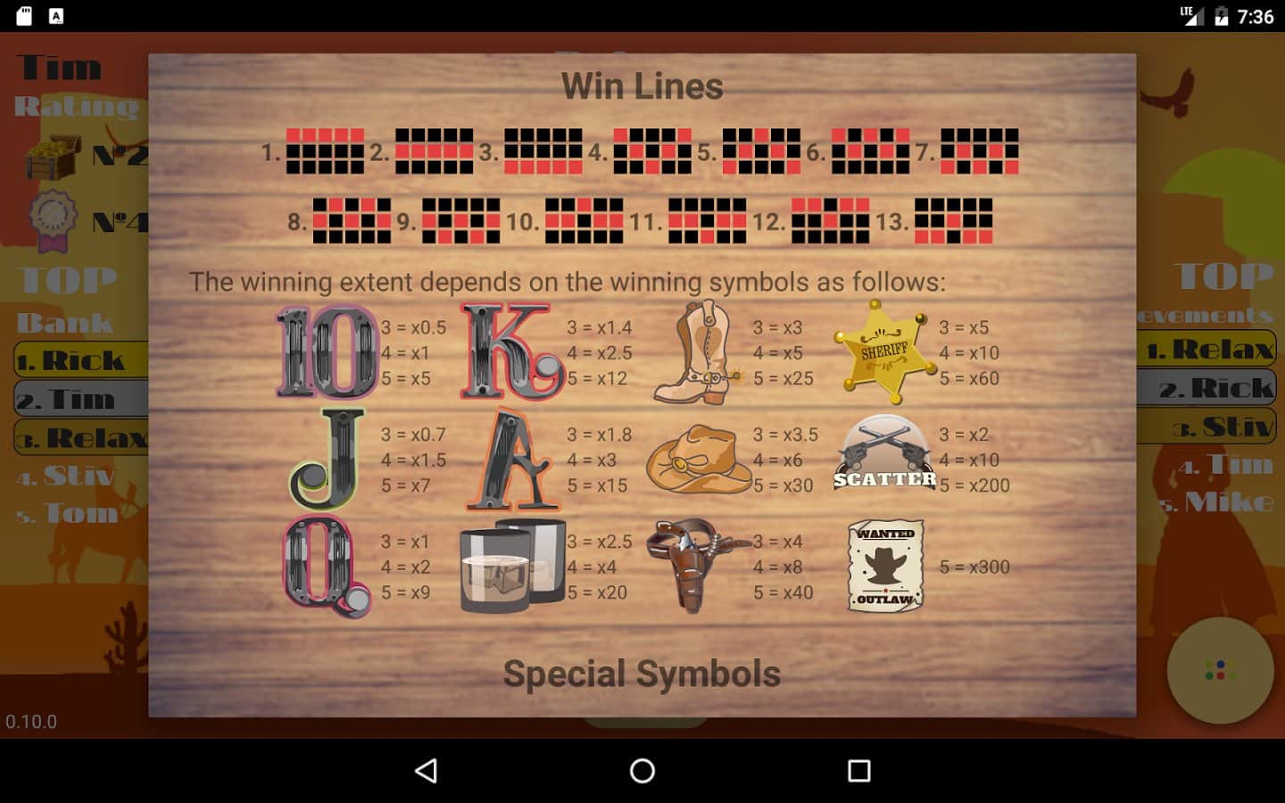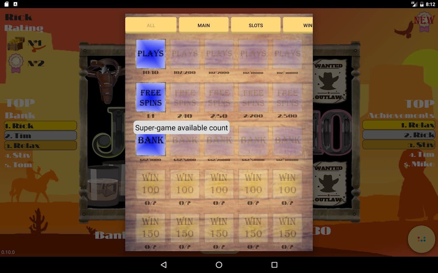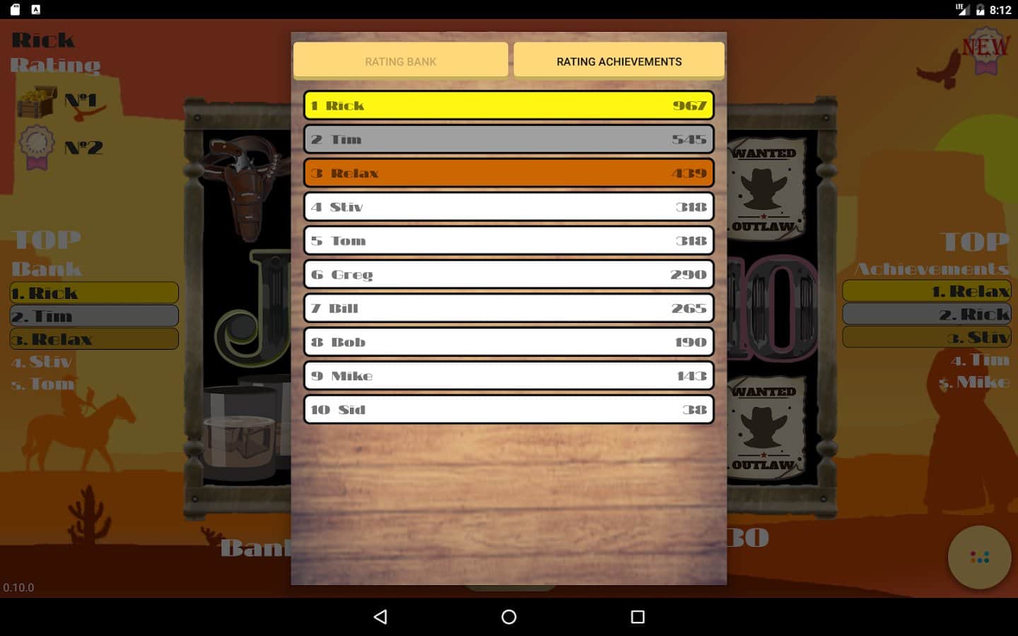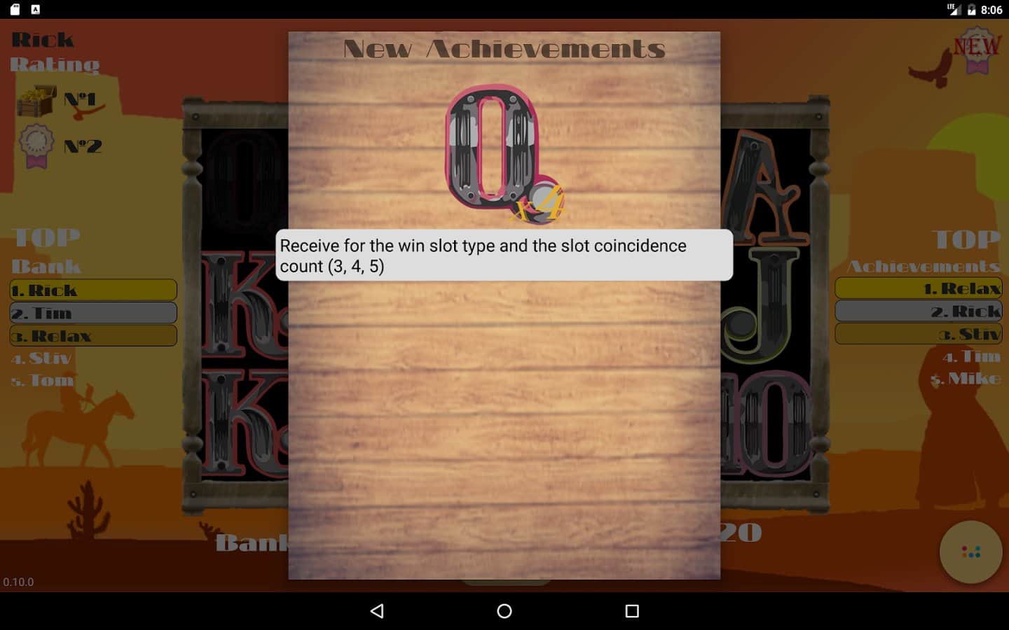 Rating Slots – слот-машина на андроид, где вы сможете на деле проверить свою удачу. Эта игра выполнена в стиле Дикого Запада, где вашей главной задачей будет набрать максимальное количество монет и достижений. Делайте свои ставки и запускайте в работу слот-машину, наблюдая за тем как крутятся барабаны и выстраиваются в линии выигрыша. Всего в игре представлено 13 выигрышных линий, заполучите их все. Поднимайтесь все выше в таблице лидеров и занимайте в ней лидирующие места, соревнуясь с друзьями и другими игроками со всего мира. Каждый день таблица рейтингов будет обновляться, так что не упустите свою возможность. Активируйте супер-игру и соберите все монеты и достижения.