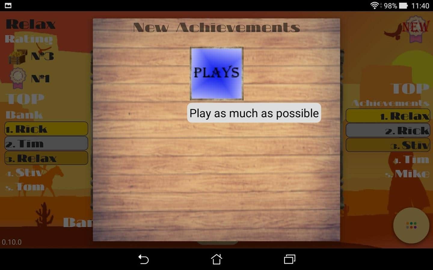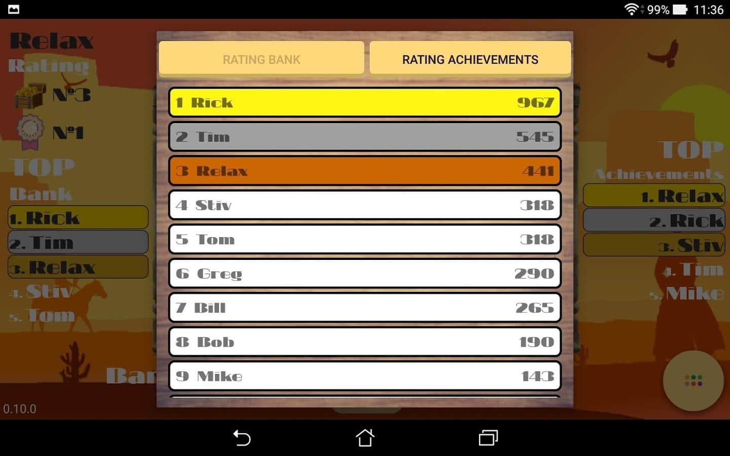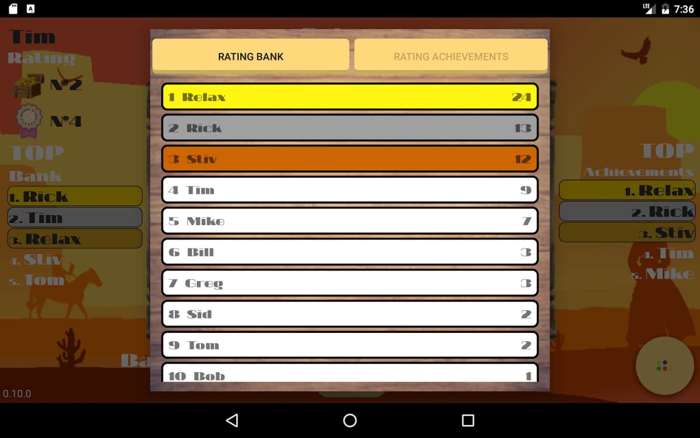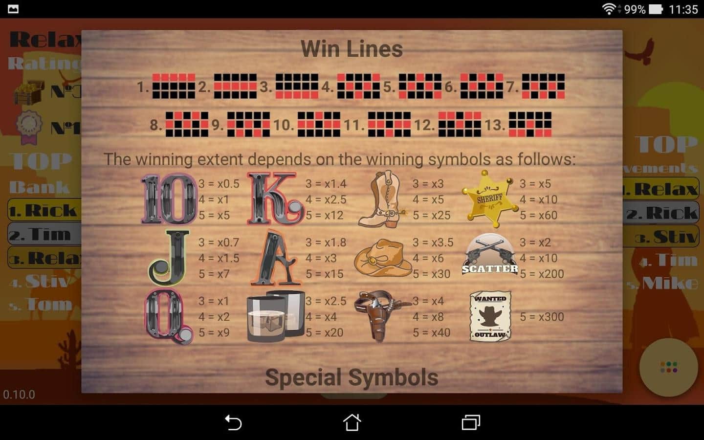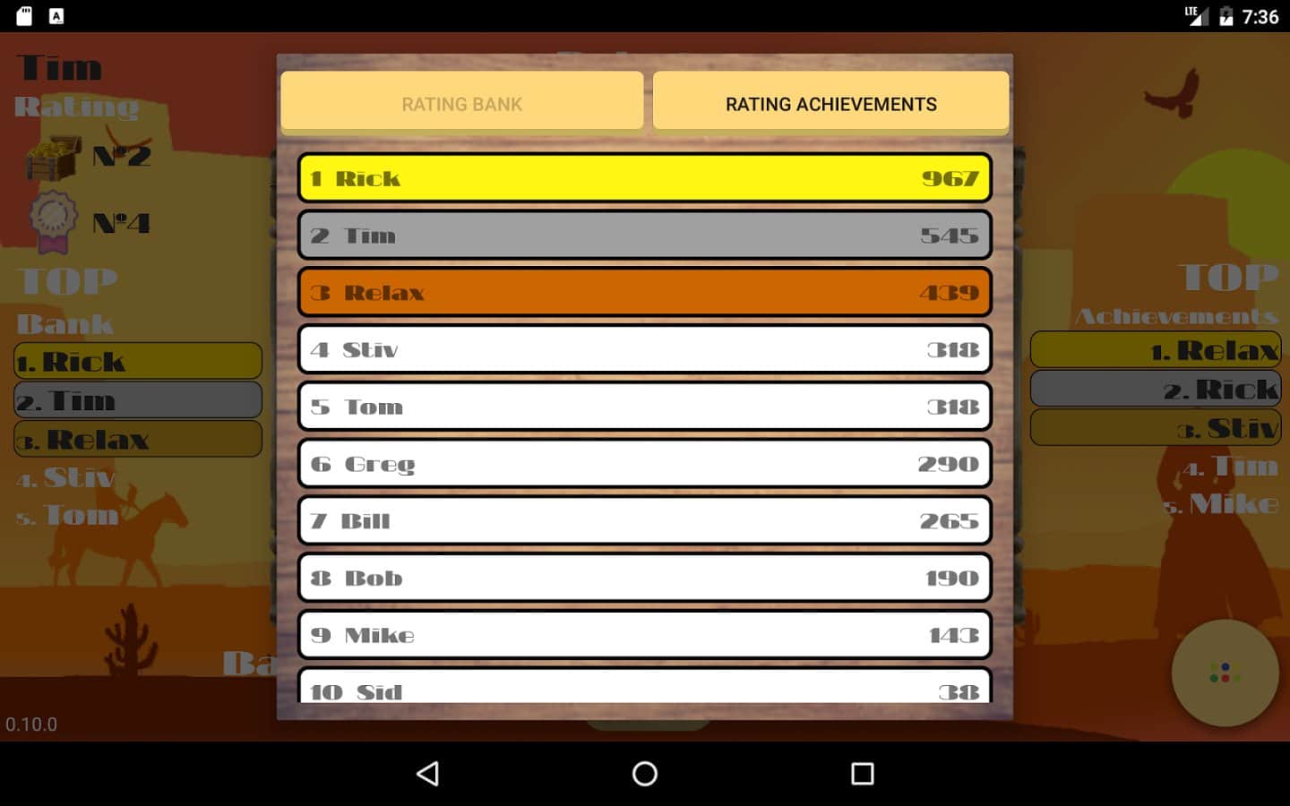 Rating Slots – слот-машина на андроид, где вы сможете на деле проверить свою удачу. Эта игра выполнена в стиле Дикого Запада, где вашей главной задачей будет набрать максимальное количество монет и достижений. Делайте свои ставки и запускайте в работу слот-машину, наблюдая за тем как крутятся барабаны и выстраиваются в линии выигрыша. Всего в игре представлено 13 выигрышных линий, заполучите их все. Поднимайтесь все выше в таблице лидеров и занимайте в ней лидирующие места, соревнуясь с друзьями и другими игроками со всего мира. Каждый день таблица рейтингов будет обновляться, так что не упустите свою возможность. Активируйте супер-игру и соберите все монеты и достижения.