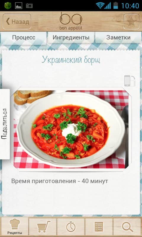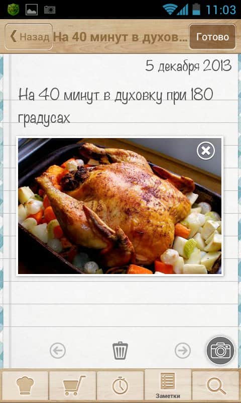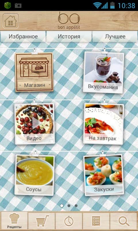 Рецепты Bon Appetit - книга рецептов на андроид с возможностью установки таймера. Большая кулинарная книга с большим количеством рецептов. У вас есть возможность оставлять свои заметки, а также составлять перечень продуктов которые надо купить для приготовления обеда. Приложение интегрировано с социальными сетями: Вконтакте, Facebook, Twitter и Instagram, так что вы сможете делиться хорошими рецептами со своими друзьями.