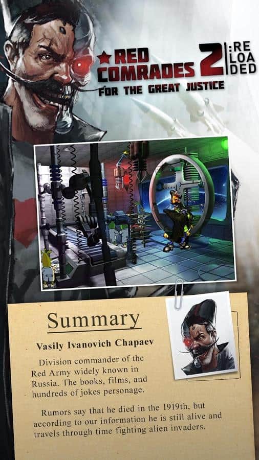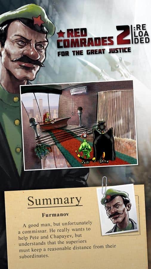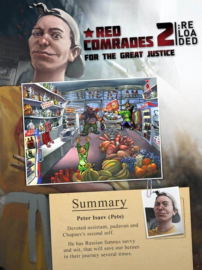 Red Comrades 2 / Петька и ВИЧ 2: Судный день – старый добрый квест про Петьку и Василий Ивановича. В своё время серия игр с этими героями завоевала сердца многих геймеров. Спустя 15 лет игра вновь появилась, но теперь только на ваших мобильных androidдевайсах. В этой части на землю прилетели опасные для человечества инопланетяне. Вам необходимо помешать планам пришельцев и каким-то образом достать микрочип из головы Василий Ивановича. Как и всегда игра содержит огромное количество уморительных шуток, анекдотов и интересных баек. Как и всегда головоломки и задачки будут встречаться вам на каждом этапе прохождения игры.