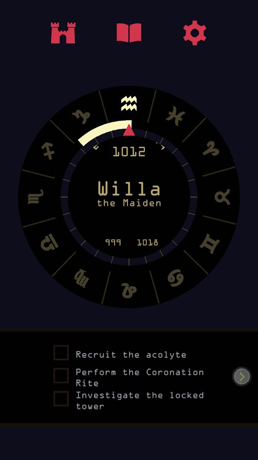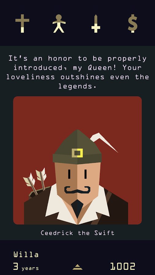 Сначала он кажется простым, но это вовсе не так! Он здесь ОЧЕНЬ разнообразен. По сути, нам нужно просто принимать различные решения и следить за статусом показателей. Выбор осуществляется свайпом вправо-влево. Кажется довольно простым и скучным, но стоит сыграть - и данное заблуждение тут же пропадает. Показателей 4: церковь, народ, войско и казна. Следить нужно за всеми вместе. При том нельзя, чтобы статус был как слишком низок, так и слишком высок. Нужно держаться серединки. Также есть инвентарь с различными вещичками, но особенно интересно сделаны дуэли.