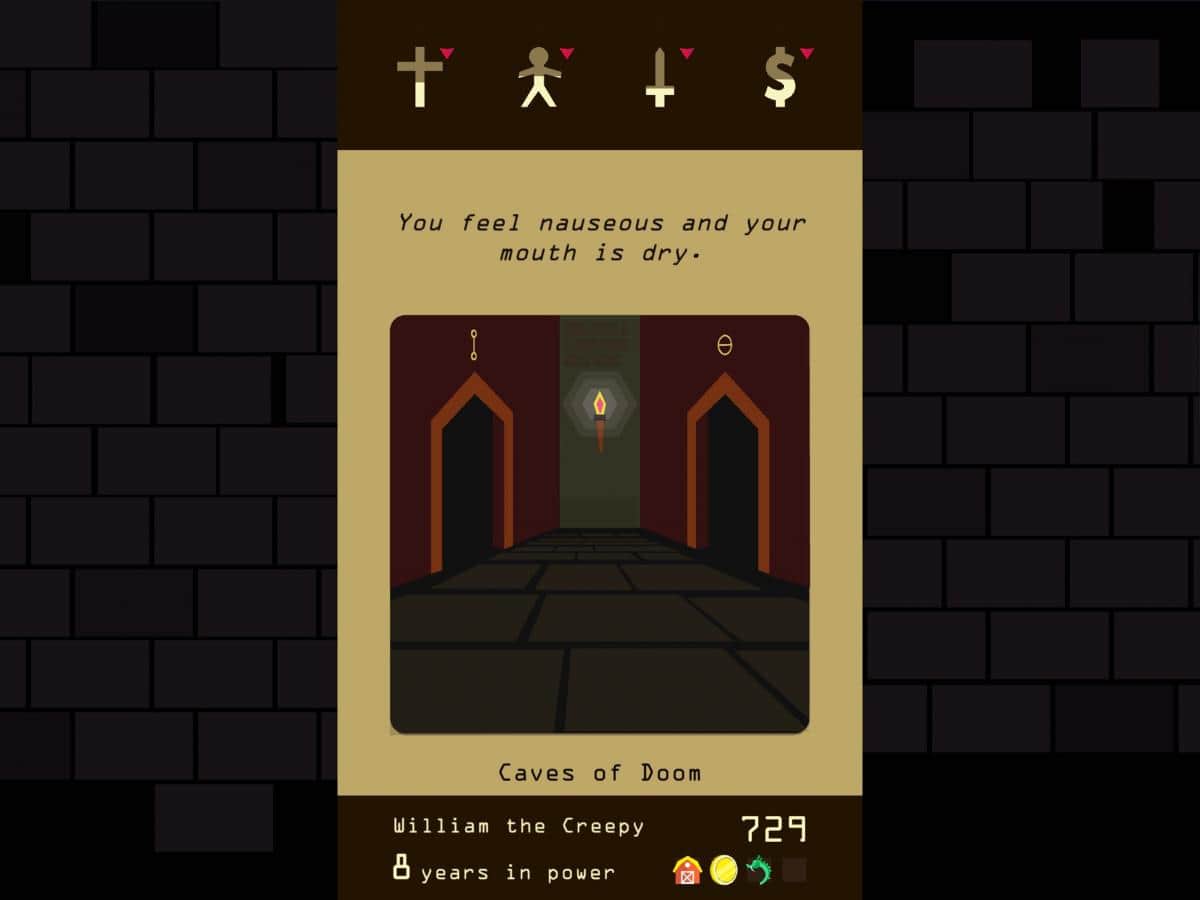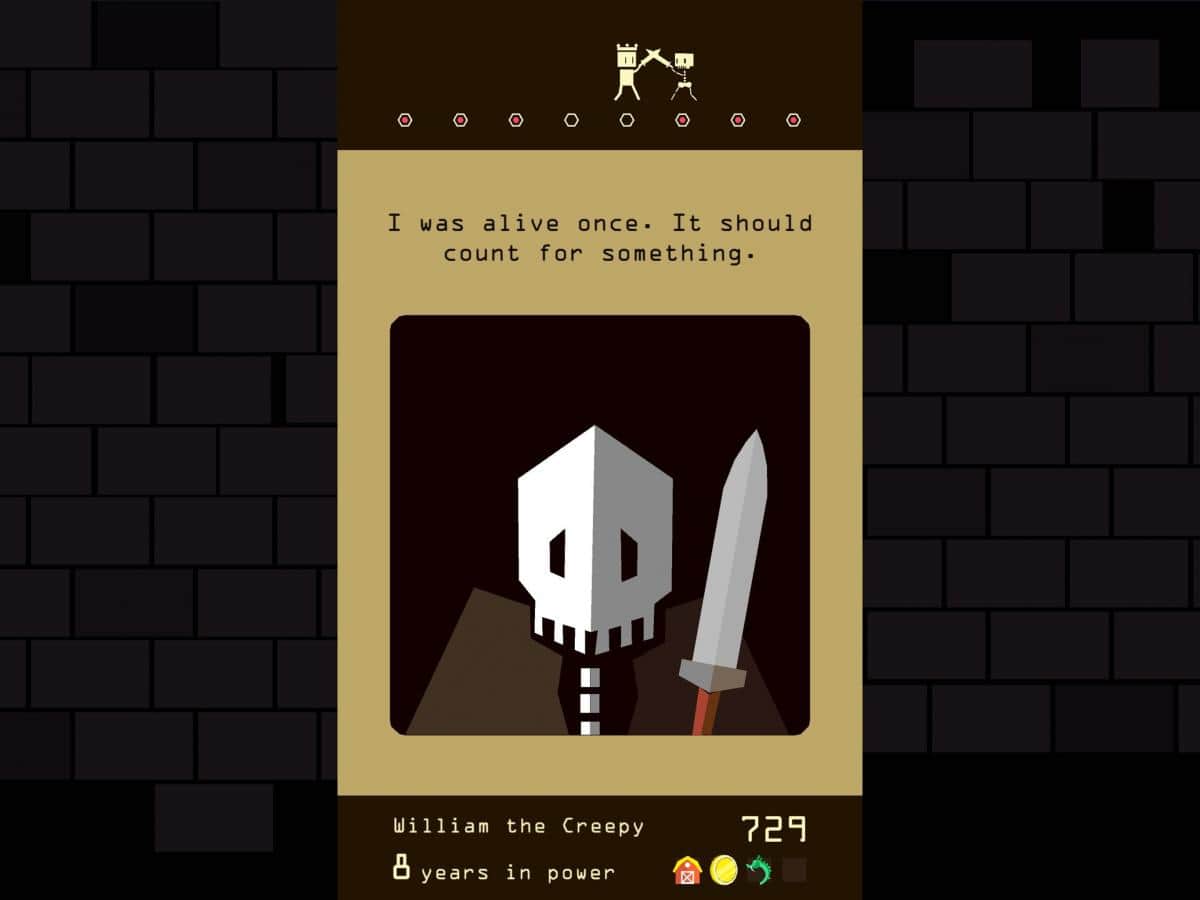 Reigns – игра в который вы будете выступать в роли короля на плечи которого ляжет большая ответственность. Игра начинается с того чтобы вы убиваете действующего короля и занимаете его место. Теперь вам необходимо заботиться о своем королевстве, принимать своих подданных и отвечать на их вопросы. От ваших ответов будет зависеть дальнейшая судьба всего королевства, а также вам необходимо поддерживать равновесие между четырьмя сторонами иначе игра начнется заново. Вступайте в бои с врагами, обзаведитесь союзниками и доживите до глубокой старости, помогая своему наследнику получить трон.
