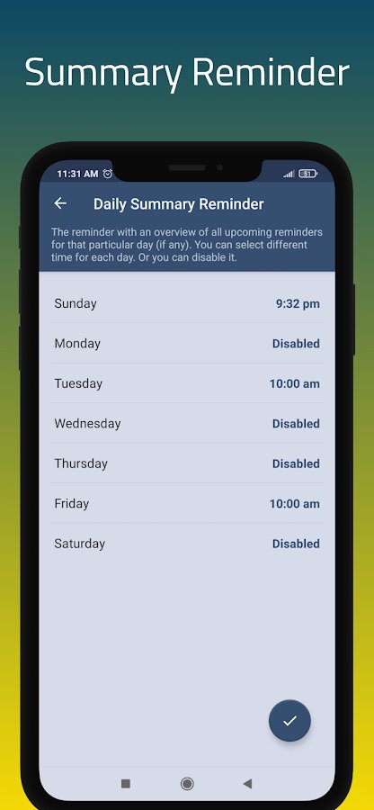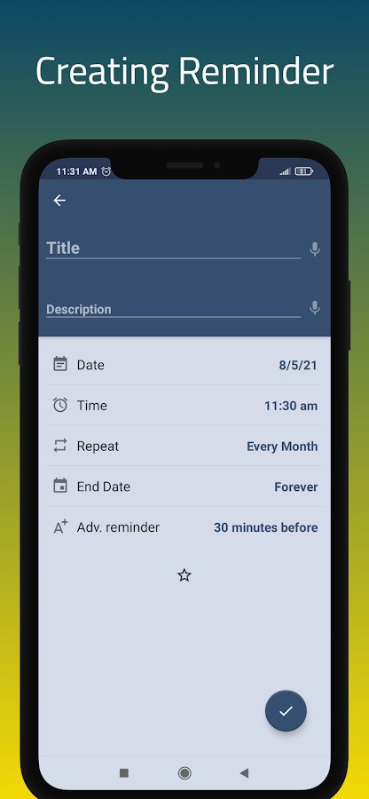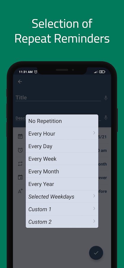 Reminder Pro - Простая и удобная напоминалка, в которой нет ничего лишнего. Боитесь что ваша память уже не та что раньше? Просто запишите нужное вам дело, поставьте время когда хотите о нем вспомнить, и это приложение сделает всё за вас! Конечно дело в итоге предстоит делать вам, но вы хотя бы о нем не забудете. Вы можете сохранять выполненные дела, или же просто удалять их. Сохраняя их, они будут перемещаться в отдельную категорию, и вы всегда сможете посмотреть что вы уже сделали, и когда это было. Оставляйте заметку на день, месяц или же на год вперед, и это приложение никогда не забудет вам напомнить о ней.