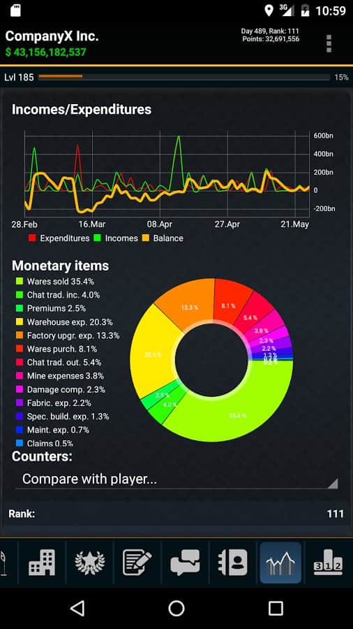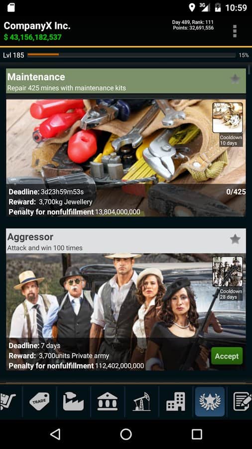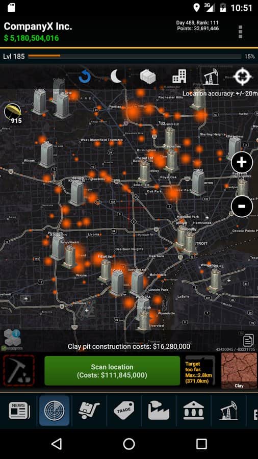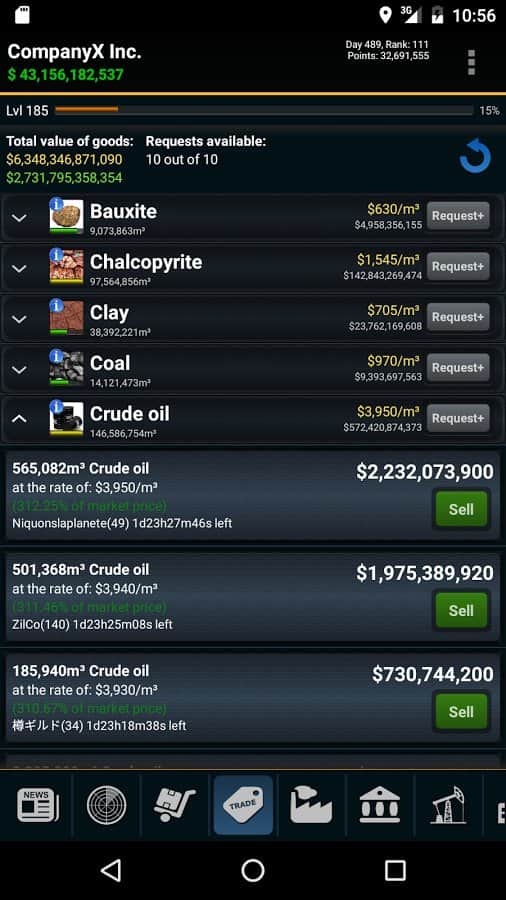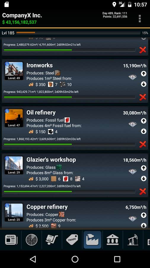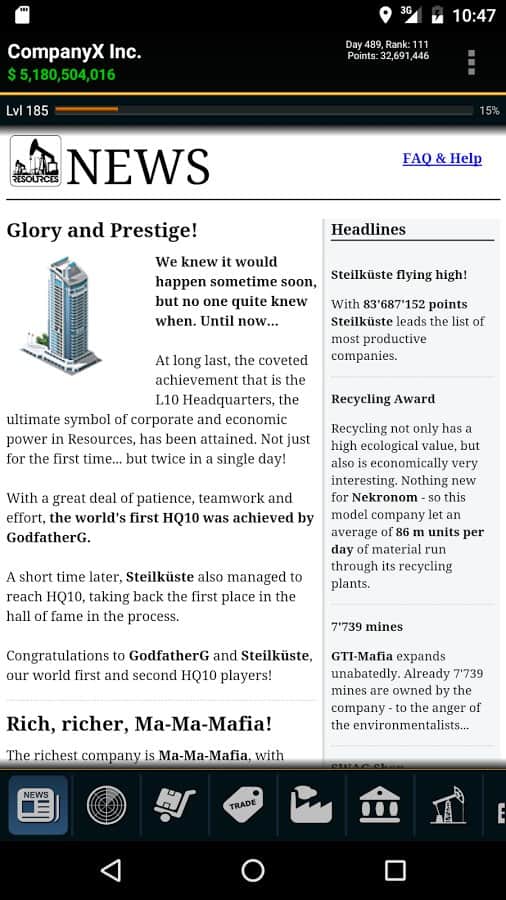 Resources Game – стратегия на андроид, где вам предстоит возглавить компанию по добычи полезных ископаемых. В этой игре для вас откроется огромная карта всего мира, где вам предстоит добывать полезные ресурсы и ископаемые. Путешествуйте по всему миру и открывайте для себя все новые и интересные месторождения угля, нефти, золота и других не менее значимых ресурсов. На месте где есть руда стройте шахты по добыче, устанавливайте буровые вышки, добывая нефть в огромных количествах и продавайте все что добыли на рынке, получая за это огромные деньги. На заработанную прибыль улучшайте и расширяйте свою компанию, делая ее огромной корпорацией и уничтожая при этом своих конкурентов.