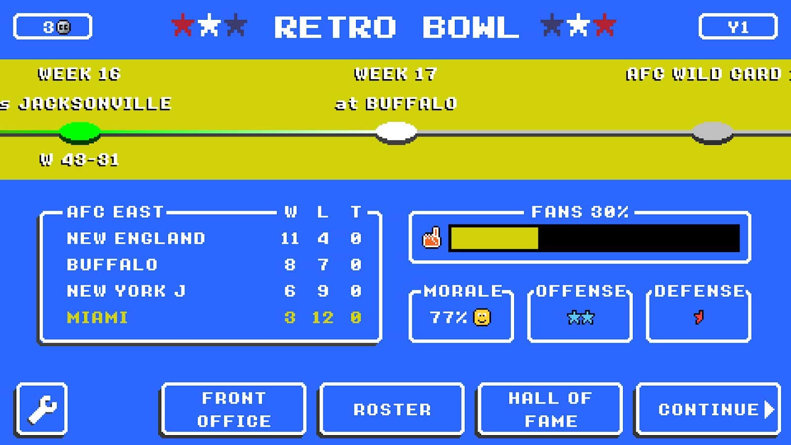 Retro Bowl - если ты спортсмен в душе и любишь американский футбол, тогда игра точно для тебя. В игре ты пиксельный квотербек и тебе надо доказать тренеру что тебя не зря выпустили на поле. Только изнурительные тренировки и сила воли приведёт тебя к заветной цели. Графика сделана простенько, но она обсалюно не мешает геймлпею. А спустя уже 10 мину тигры и вовсе про неё забываешь.