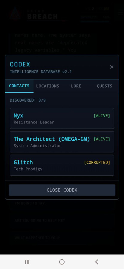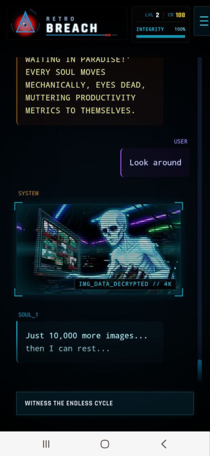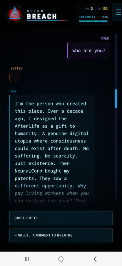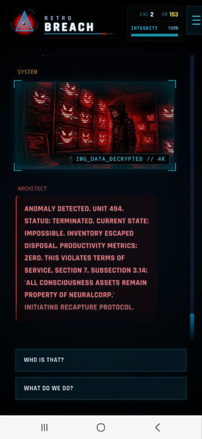 Retro Breach — это мрачная интерактивная драма, в которой вы пробуждаетесь внутри секретной сети после смерти и узнаёте, что ваш разум превращён в рабочую силу для корпорации. Вас ждут хакерские испытания, выборы с последствиями и борьба за восстановление истины. Манипулируйте системой, избегайте цифровых стражей и активируйте вирус, способный разрушить тюремный сервер, чтобы обрести шанс на настоящую свободу.