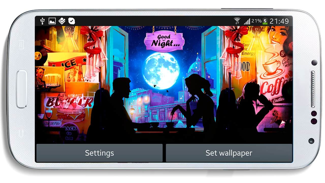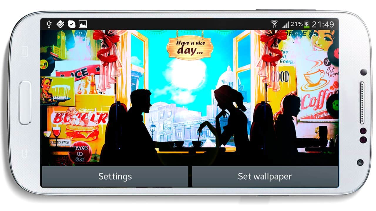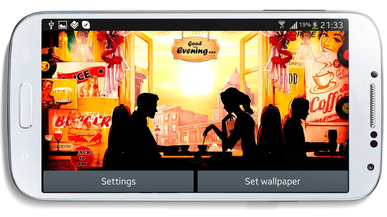 Retro Cafe Live Wallpaper – красивые живые обои на ваши андроид телефоны, сделанные в духе 60-х годов. Если вы любите обстановку городских кафе и любите там проводить свое свободное время наблюдая за другими посетителями то эти живые обои созданы для вас. Установите их в свой телефон или планшет и наблюдайте за различными парами, сидящими в кафе сделанными в стиле 60-х годов. Обои вас порадуют плавной сменой дня и ночи, в зависимости от времени суток на ваших часах. Наслаждайтесь анимированными обоями и рассматривайте подробные сцены в альбомном и портретном режиме своего телефона.