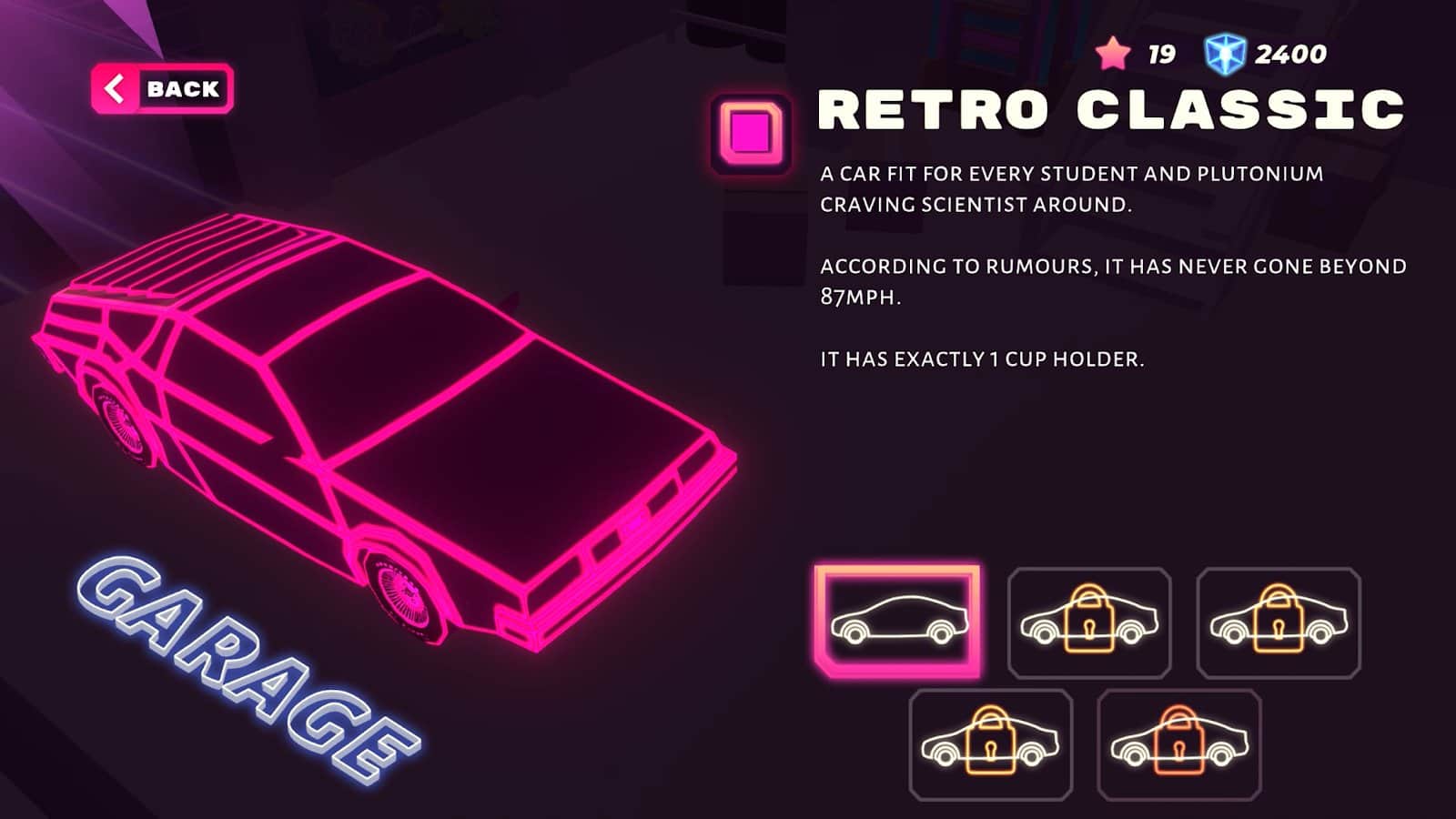 Ретровейвная атмосфера есть. Известные синтвейверы есть. И баги есть. Управление не очень удобное, машино постоянно заносит наповоротах. В игре есть забавный баг: вы сможете купить машину, даже если у вас недостаточно денег. Баланс правда уйдет в минус, но когда денег будет опять больше 0, можно будет купить машину (хотя машины можно и не покупать, а срaзy выбрать заблокируванную, выйти из гаража и начать заезд). Так же можно поломать модель заблокированой машины, сменив ей цвет. А вообще, смысл в машинах только во внешнем виде. Все они не разгоняются свыше 87 миль в час (а то сделают скачок во времени?)