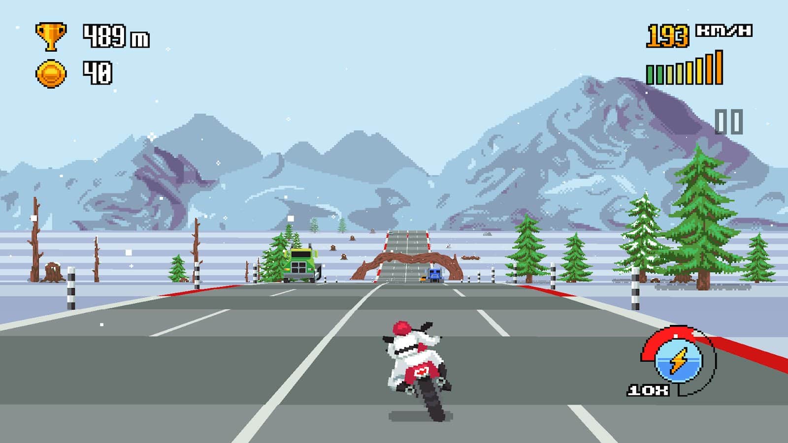 Retro Highway - классический пиксельный ранер от первого лица в котором вам предстоит управляя мотоциклом постараться преодолеть как можно большее расстояние, при этом избегая столкновений с другими участниками движения. На полученные деньги и опыт вы сможете приобрести новые виды техники или же развить уже имеющиеся. Кроме этого вся игра разделена на несколько десятков уровней которые будут открываться по мере прохождения. Графическая часть игры выполнена в приятном пиксельном стиле, а управление представляет из себя казуальную модель.