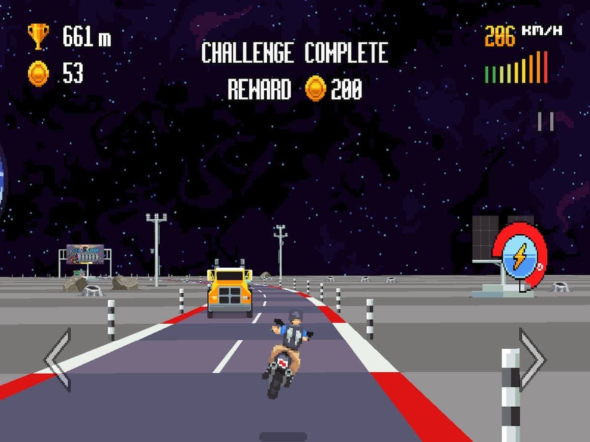 И так мой взор впал в эту игру. Мне она понравилась изза ее ретро стиля. Очень похожа на старые игры на сеге. Вообщем это ранер, где Вы едите по шоссе на мотике. Тут есть много карт. Чтобы их открыть нужно выполнить определенное количество заданий. Они бывает и сложные! Так же тут есть монеты. За них Вы можете покупать улучшения, да и новые мотоциклы.