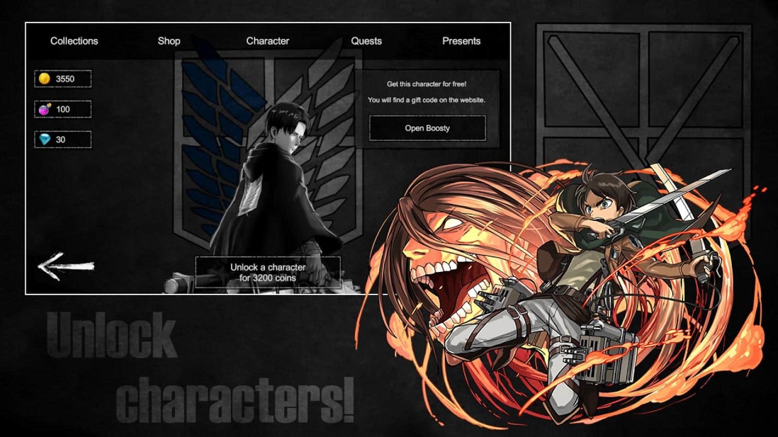 Исследуйте уникальный мир титанов: откройте для себя удивительную вселенную, наполненную захватывающими историями и опасными испытаниями. Почувствуйте себя разведчиком, который отправляется на встречу приключениям и битвам. Играйте за разных персонажей и раскрывайте их истории. Каждый из персонажей имеет собственные способности, которые помогут создавать уникальные стратегии. Проверьте свои умения в эпических сражениях с огромными титанами, чтобы покорить их силу и воспользоваться уникальными способностями этих гигантов в самых сложных битвах! Преодолейте испытания и оставьте свой след в истории!