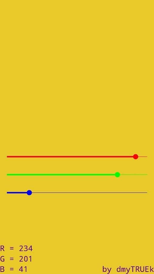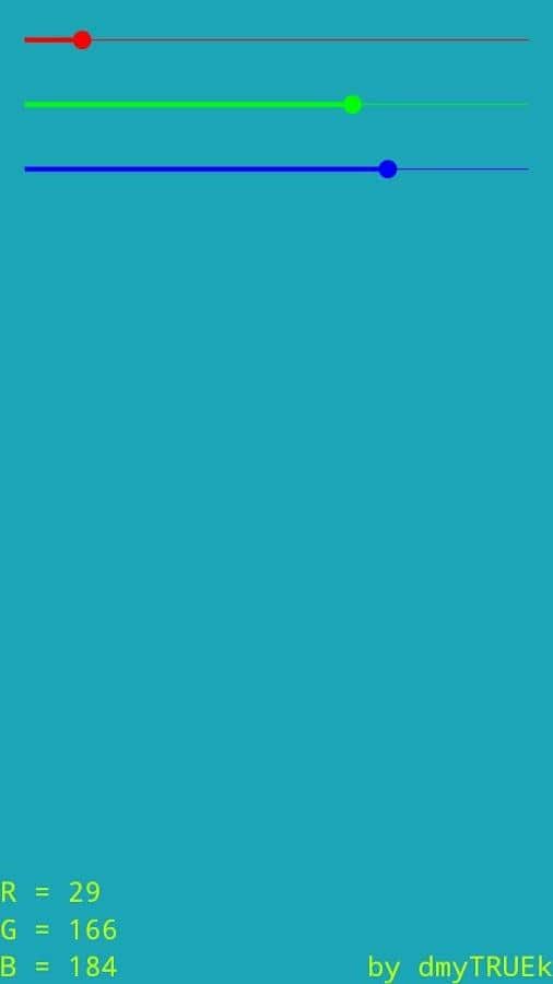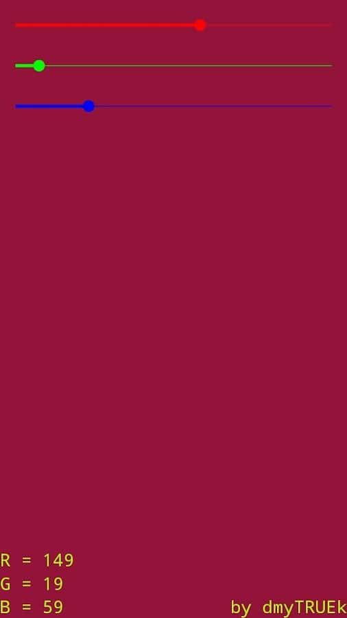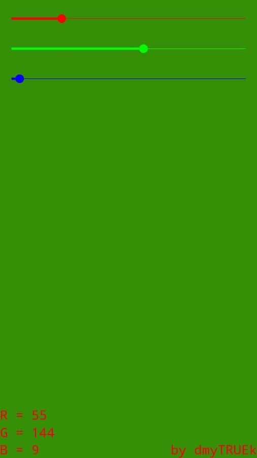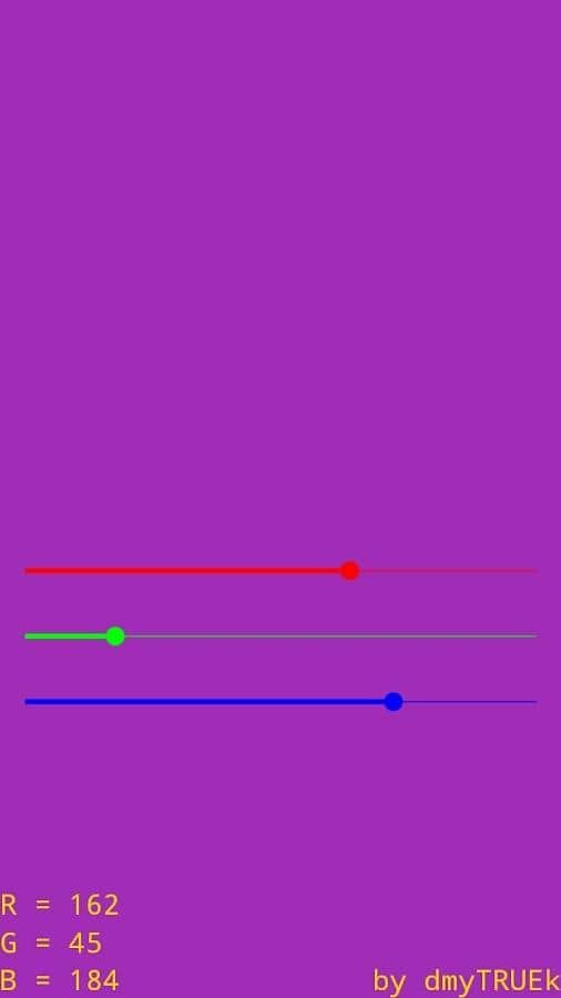 RGB - colors mixer - Первоначально все цвета складываются с трёх основных, а именно синего, красного и зеленого, но для получения других цветовых решения необходимо составить определенную комбинацию для получения желаемого результата. Для прокрутки вниз используйте свайп пальцами вниз, чтобы открыть полосы, а для прокрутки вверх наоборот — свайп пальцами вверх. После открытия необходимых полос у вас есть возможность регулировать их в любую сторону, просматривая эффект на экране с получившимся цветом. Посмотрите сколько именно красного, зеленого и синего цвета вы добавили с помощью статистики внизу экрана.