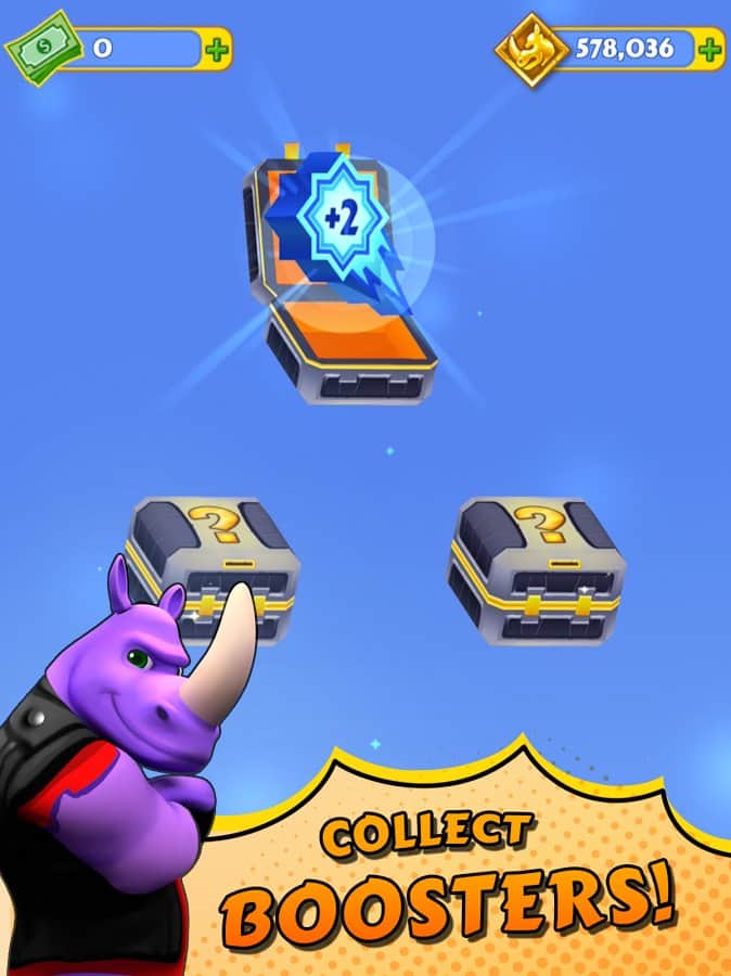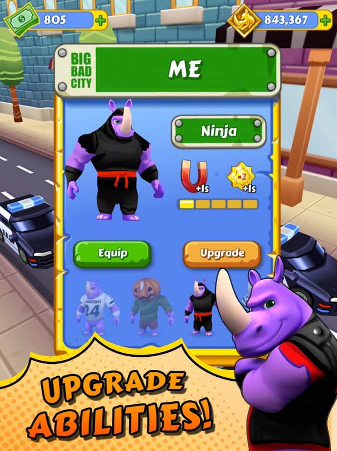 Rhinbo – раннер на андроид, где вы будете помогать яростному носорогу сбежать от полиции. Возьмите под свой контроль носорога и бегайте по оживленным улицам города, разрушая все на своем пути. Пока ваш персонаж мчится вперед вовремя нажимайте на экран своего телефона или планшета чтобы он совершал прыжки, запрыгивал на автомобили и проскакивал под препятствиями. По пути своего следования собирайте чемоданчики с бонусами, которые позволят носорогу сбивать полицейские машины у себя на пути. Приобретайте для своего героя модные куртки и улучшения. Бегайте по разнообразным локациям и наслаждайтесь удобным управлением.