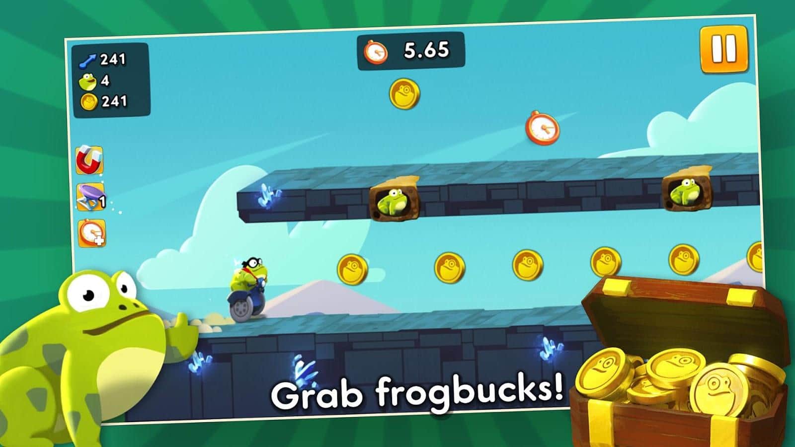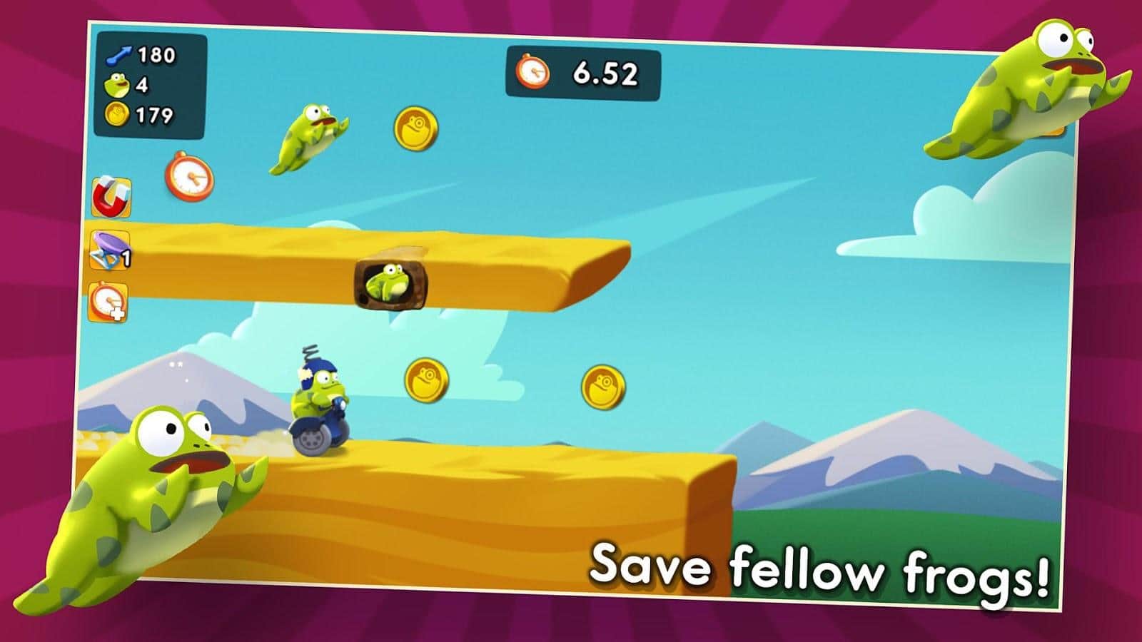 Теперь команда из Playmous решила посадить своего главного персонажа на Фрогвей и заставить лягушку быстро перемещаться вперед через препятствия. В игре Ride With the Frog геймер будет управлять лягушкой на специальном транспорте и мчаться вперед, собирая по пути полезности и огибая препятствия. А все это для того, чтобы быстро освободить своих собратьев из западни и промчаться по новым трассам на невероятных скоростях. Усади свою лягушку на Фрогвей и покоряй километры пути, собирая полезные предметы!