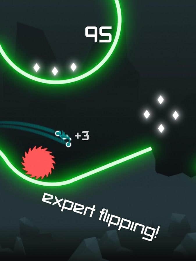 Главное достоинство Rider заключается в его простоте - игра имеет интуитивно понятное управление,которое состоит всего лишь из одного касания экрана.Нажимая на экран, вы активируете прыжок,и толкая палец вниз,можете выполнять сальто.
