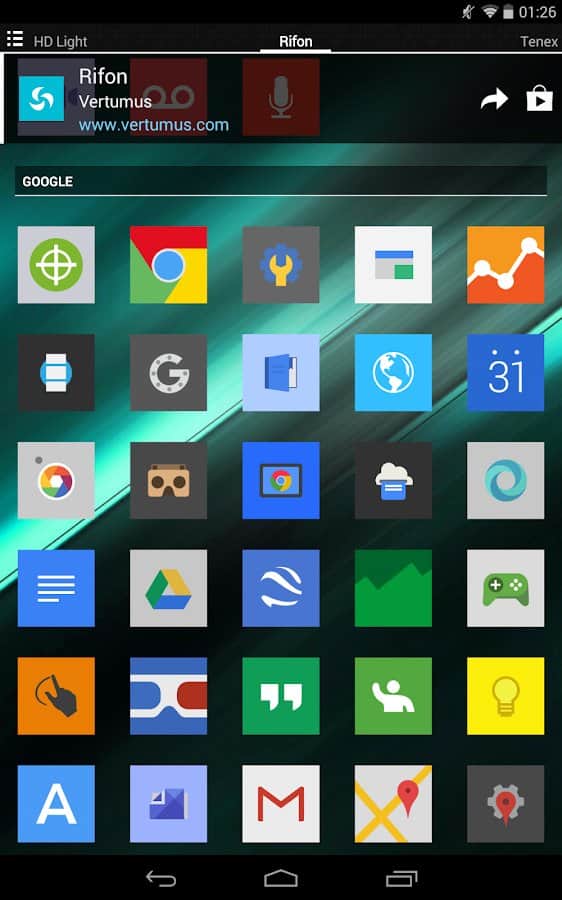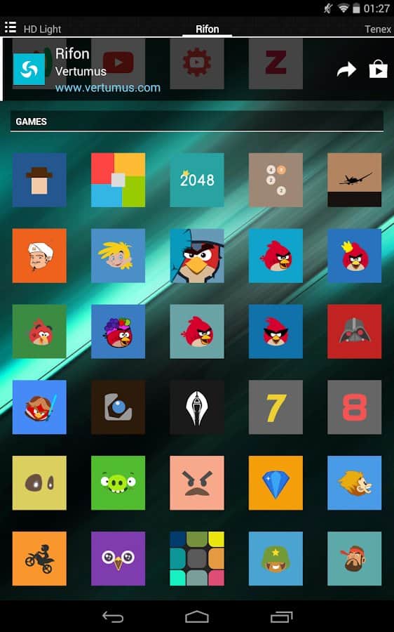 Отличный и удобный лаунчер для андроид девайсов. Приложение специально разработано для того, чтобы ваш девай был легко узнаваем среди тысячи других! Огромное количество стильных иконок выполненые в HD формате, новые обои, темы. динамический календарь и многое другое. Все это ждет тебя в приложении Rifon.