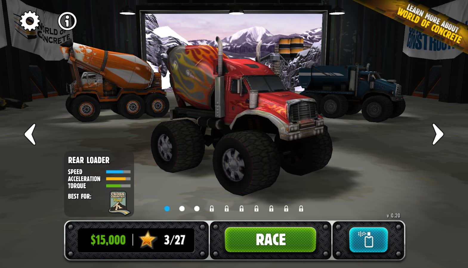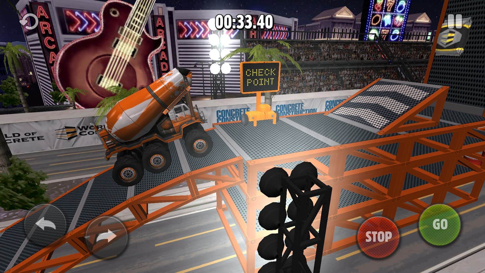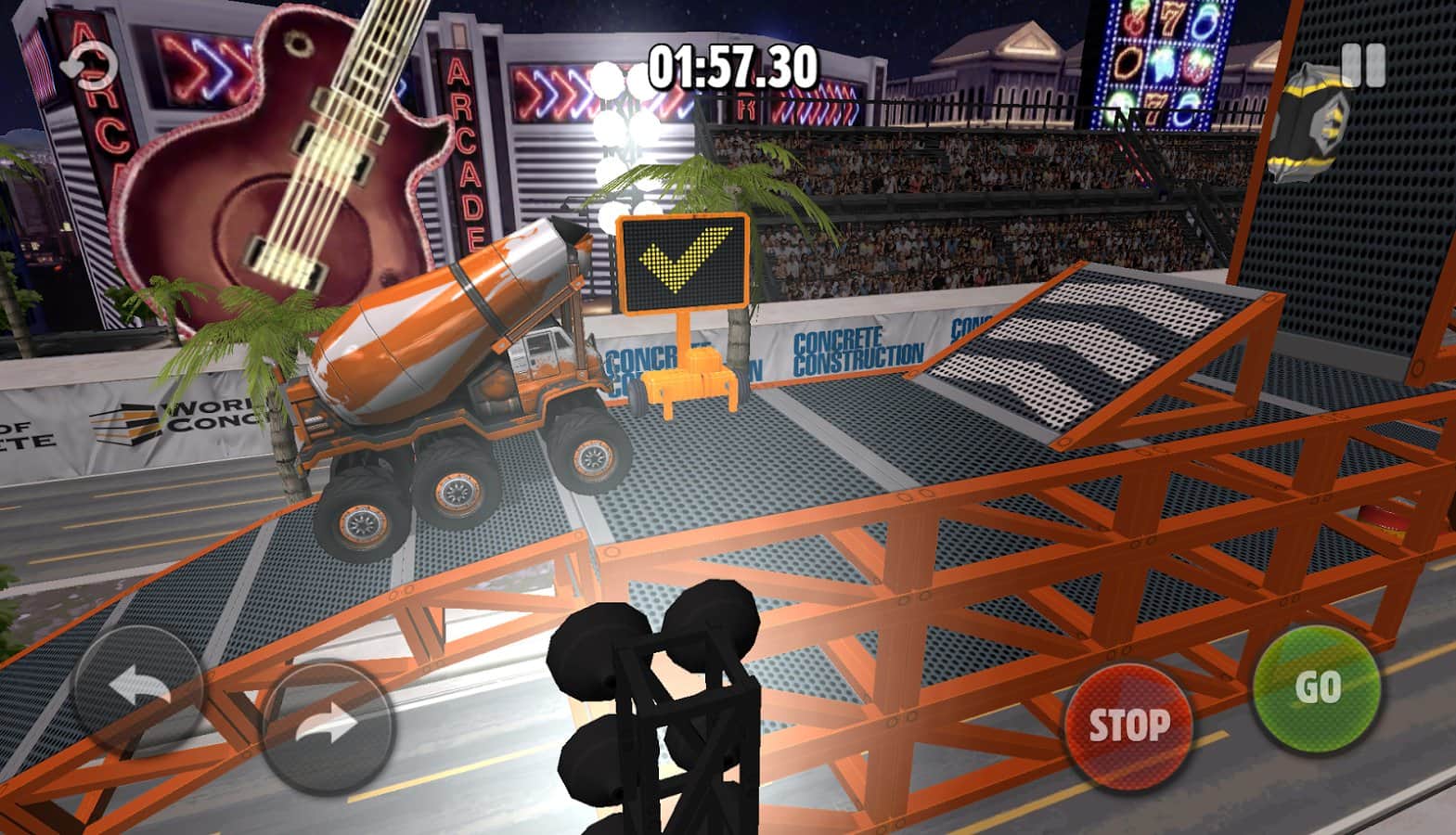 Rig Racin' - Захватывающие гонки на андроид, в которых вам предстоит ездить на бетономешалке и выполнять различные трюки. Вас ждут крутые петли и трамплины, крутые подъемы и спуски. Регулируйте скорость и наклон грузовика, чтобы он не перевернулся. А самая главная изюминка игры это то, что уровни надо проходить на время. Если вы будете долго ехать, цемент засохнет и вы проиграете.