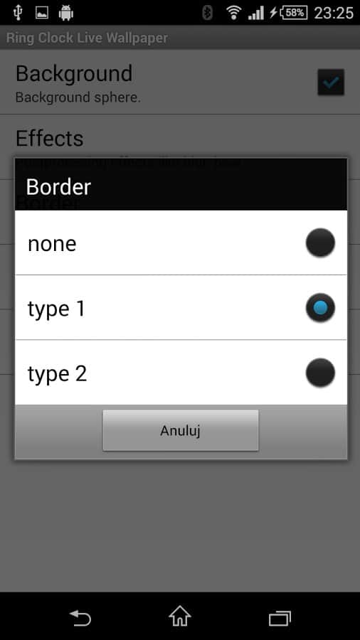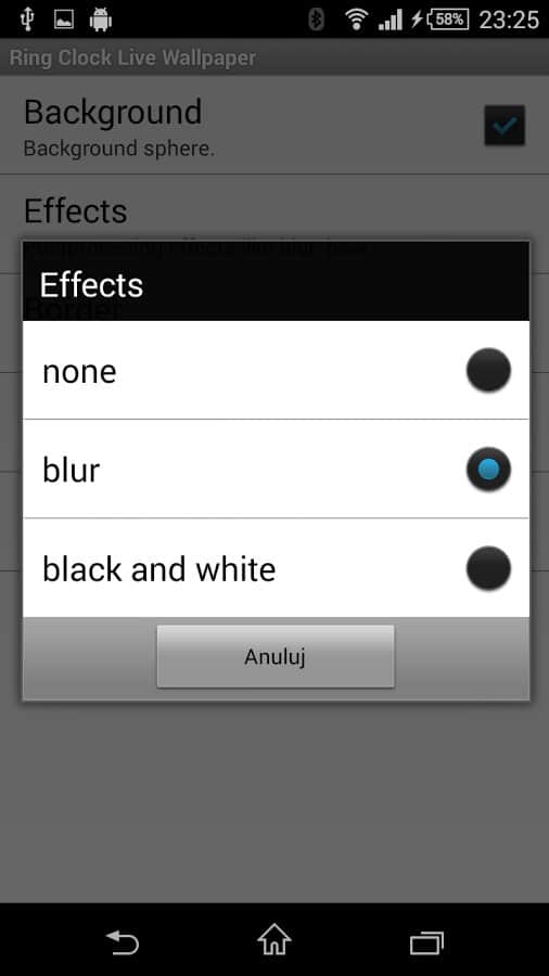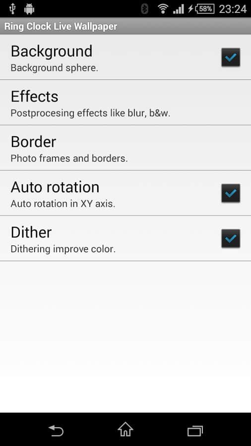 Ring Clock – живые обои на android, Выполненные на довольно высоком уровне и совмещающие в себя красоту и функциональность. Многие живые обои обладают лишь одой функцией – это изменение графической оболочки, которая может порадовать своего обладателя щеголяя новыми красками и дизайном. Но эти живые обои помимо всей их красоты, могут показывать время, сегодняшнюю дату, а так-же наглядно демонстрировать сколько осталось заряда у вашего мобильного девайса. Обои обладают несколькими эффектами: размытие, оттенки серого, сепия или шум. Так что смело устанавливайте приложение и получайте удовольствие от его использования.