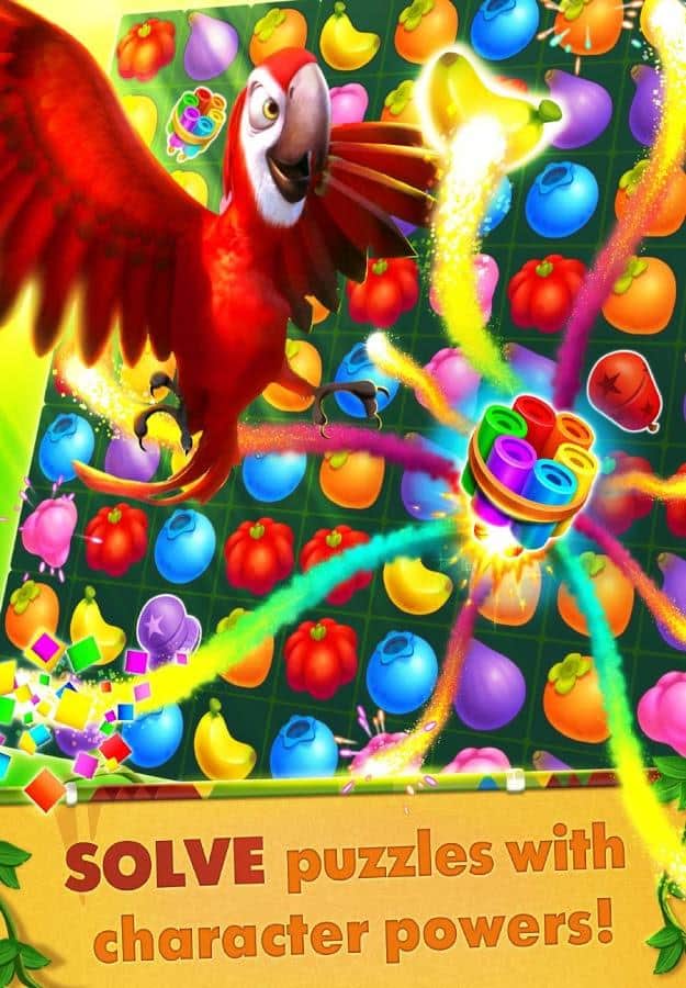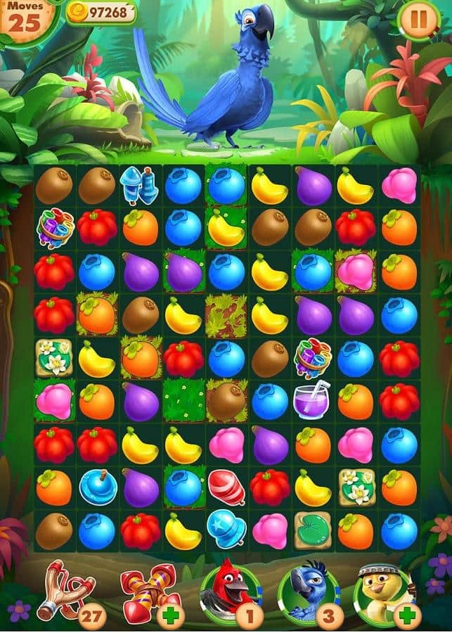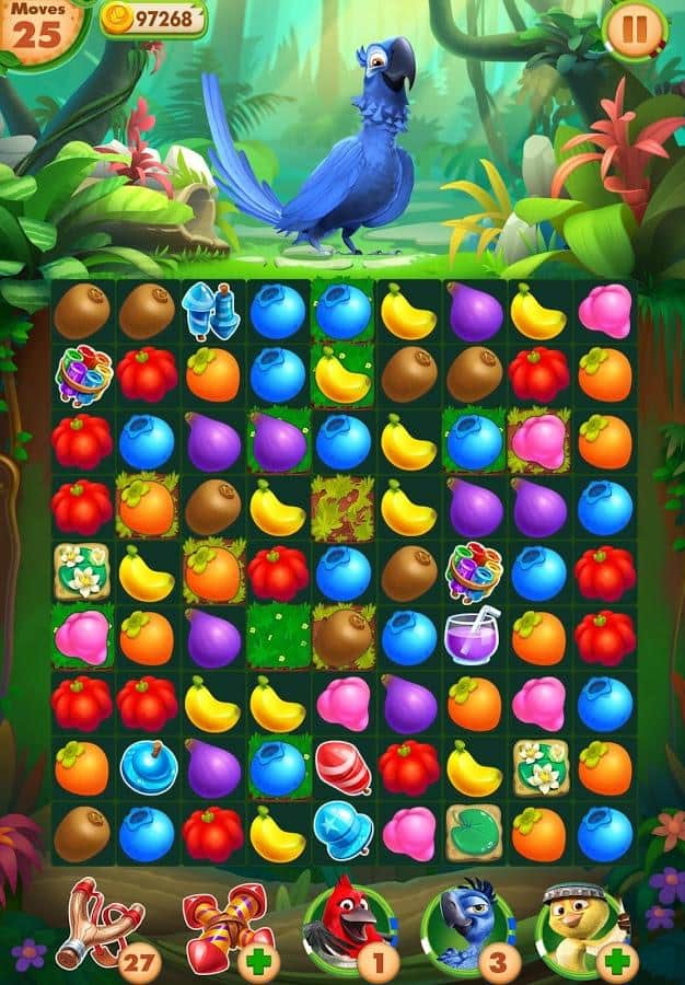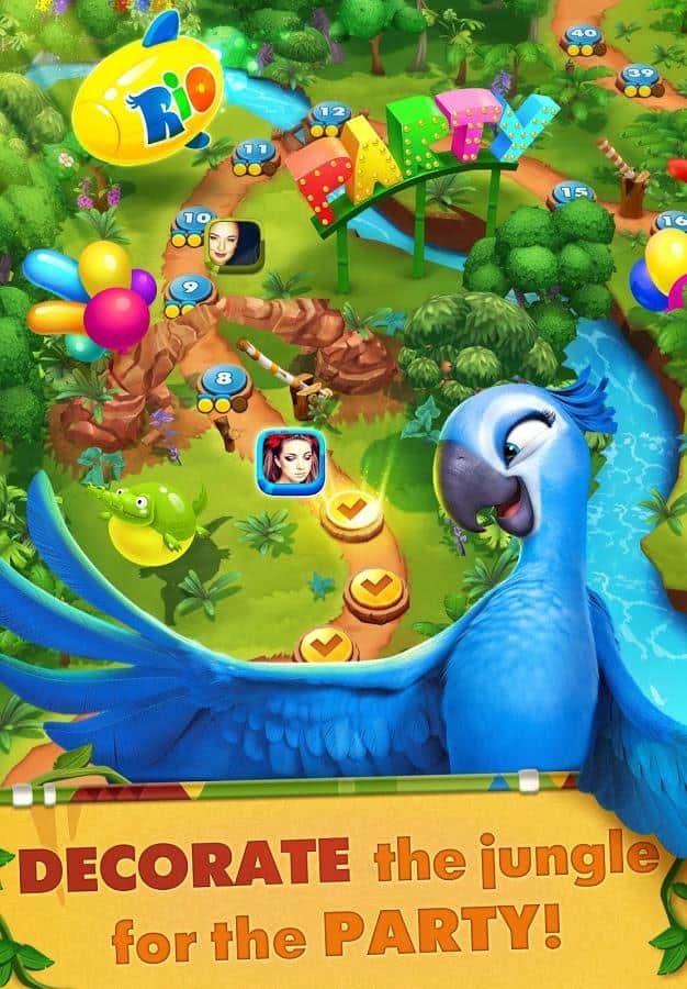 Rio: Match 3 Party – игра из жанра три в ряд на андроид, где вы вместе с главными героями мультфильма «Рио» будете устраивать вечеринку. Эта игра перенесет вас в бразильские джунгли, где вы встретитесь с забавными героями, которым будете помогать составлять ряды из сочных фруктов. Меняйте местами фрукты и составляйте ряды из трех и более объектов стараясь заполучить больше фруктов для своей вечеринки. Выполняйте все поставленные перед вами миссии и задачи и проходите уровни за минимальное количество ходов. Составляйте максимально длинные ряды и запускайте в действие цепную реакцию и получайте долгожданные бонусы. Старайтесь собрать много фруктов и подняться на самый верх таблицы лидеров.