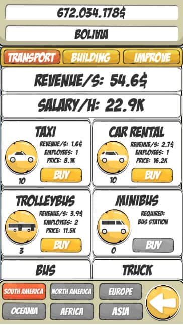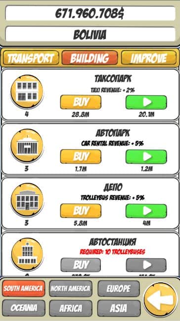 Road Tycoon Simulator – захватывающий симулятор на андроид, где вы будете управлять своей транспортной компанией. Станьте владельцем небольшой компании и приведите ее к процветанию и достатку. Приобретайте различные транспортные средства, стройте здания и нанимайте опытных работников и водителей. Улучшайте свои навыки бизнесмена и открывайте для себя новые страны по перевозке товаров. Вашей главной задачей в этой игре будет стать владельцем компании мирового уровня и постоянно улучшать свой бизнес. В этой игре представлено 90 стран, 6 видов транспортных средств и множество зданий.