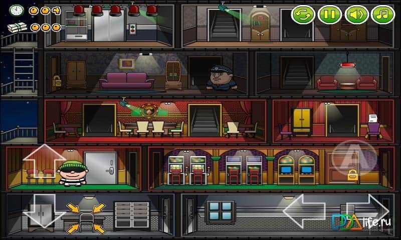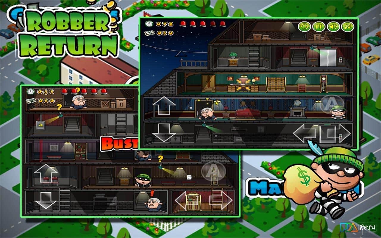 Robber Return - игра на аndroid, в которой вы погрузитесь в захватывающий и опасный мир вора. Главный герой родом из семьи воров и у него это в крови. Ему предстоит выполнить опасную миссию и ограбить казино. Но это будет сделать не так-то просто, ведь по следам за ним будет идти полиция и разъяренные хозяева домов. Помогите вору совершить ограбление и уйти от преследование с добычей.