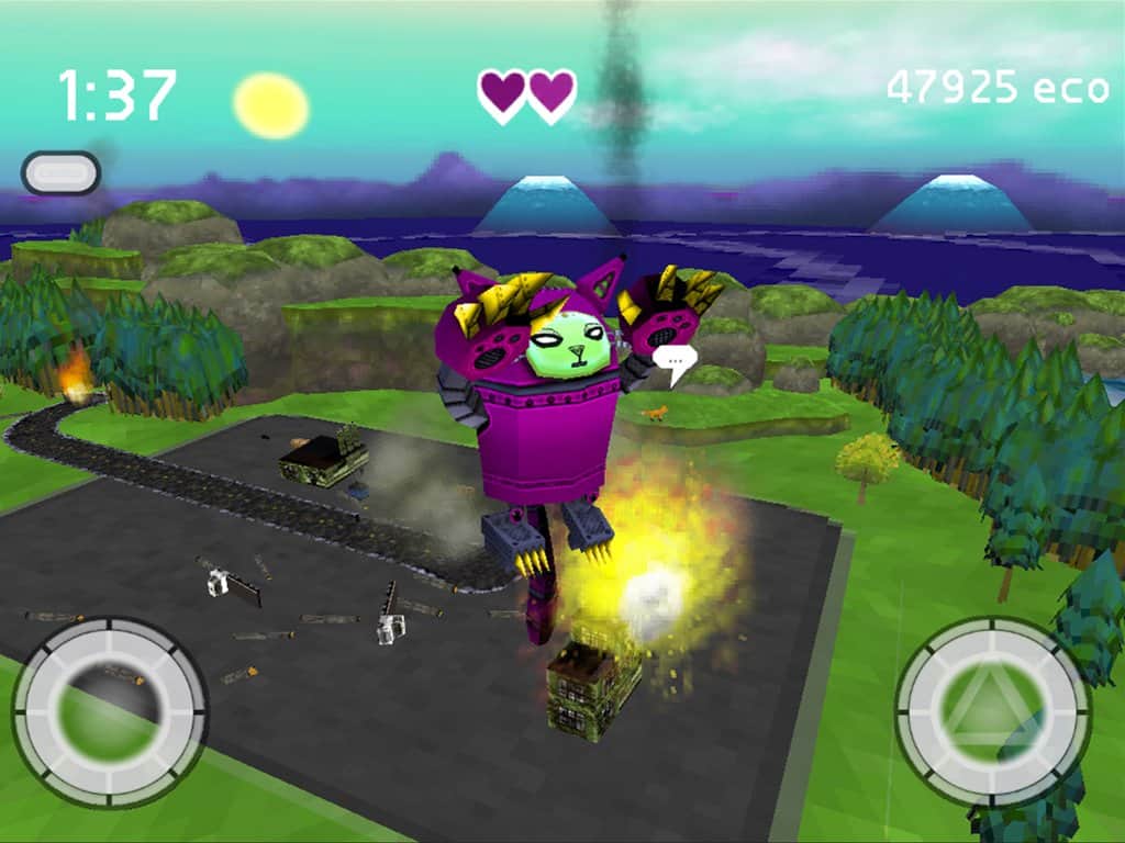 Robocat Rampage - для android в которой вы пилот гигантской кошки - робота, из космоса. Ваша миссия заключается в том, что бы сохранить природу на планете Земля в ее первозданном виде. Разрушайте города, чтобы заработать очки. Отрицательные очки даются за разрушение природы. Люди загрязнили планету и вам надо очистить ее от городов и построек. Вам предстоит подавить вооруженное восстание людей и сразиться с главным оружием человечества.