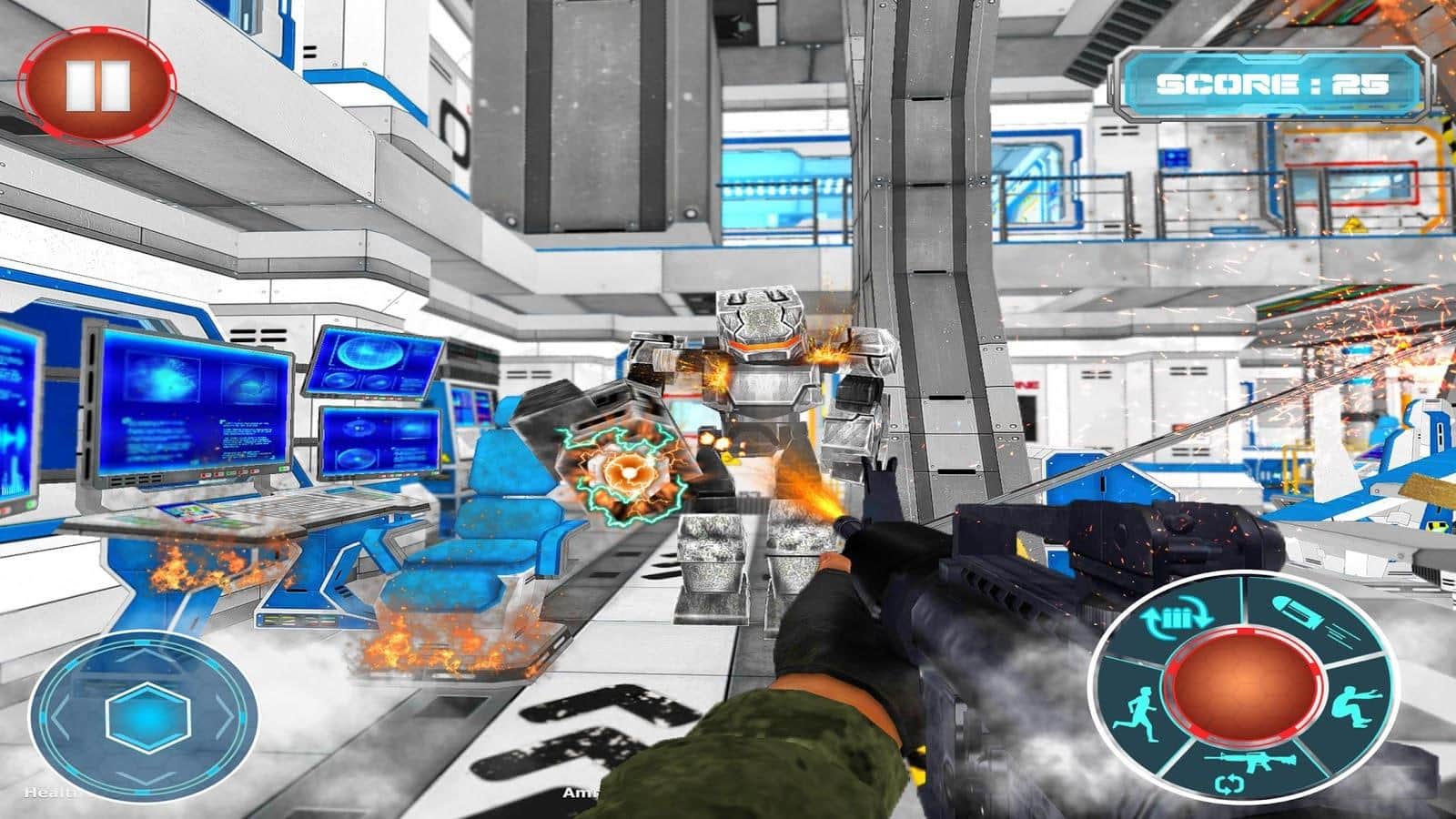 Robots War Space Clash Mission – игра на андроид, где вы будете выступать в роли бойца элитного отряда. В этой игре вам выпадет непростая миссия по уничтожению инопланетных роботов на огромном космическом корабле. Перемещайтесь по кораблю и выслеживайте свою цель. Ваш боец в этой игре будет обладать самым современным и новым оружием для борьбы с роботами, которых не так просто будет победить. Разрабатывайте свою тактику и стратегию боя, чтобы превзойти число противников умом. Ищите укрытия и ведите непрерывный огонь по роботам. Выполняйте все миссии игры и проверьте в действии все оружие, представленное в игре.