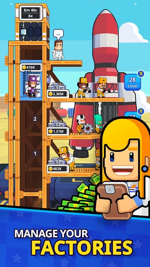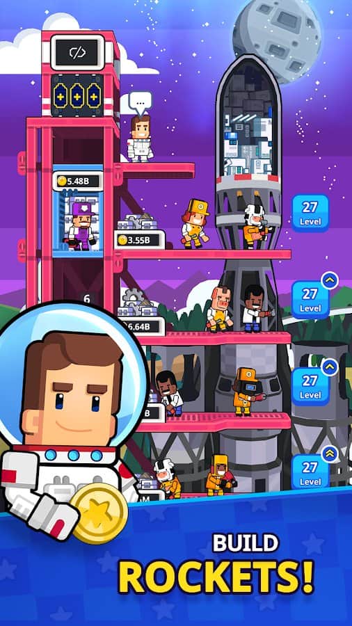 Rocket Star - Idle Space Factory Tycoon Games – захватывающая экономическая стратегия на андроид, где вы будете управлять ракетостроительным предприятием. В этой игре вы будете управлять огромным заводом и создавать ракеты различной конфигурации. Создавайте с каждым разом все более сложные ракеты и зарабатывайте деньги, а также запускайте в космос различные предметы. Ускоряйте производство ракет и запускайте реактивные двигатели что позволит вам колонизировать другие планеты. Выполняйте все поставленные миссии игры и станьте самым богатым человеком на планете высаживая своих космонавтов на Луну, Марс, Юпитер и другие планеты.
