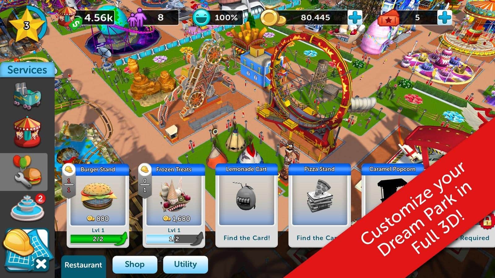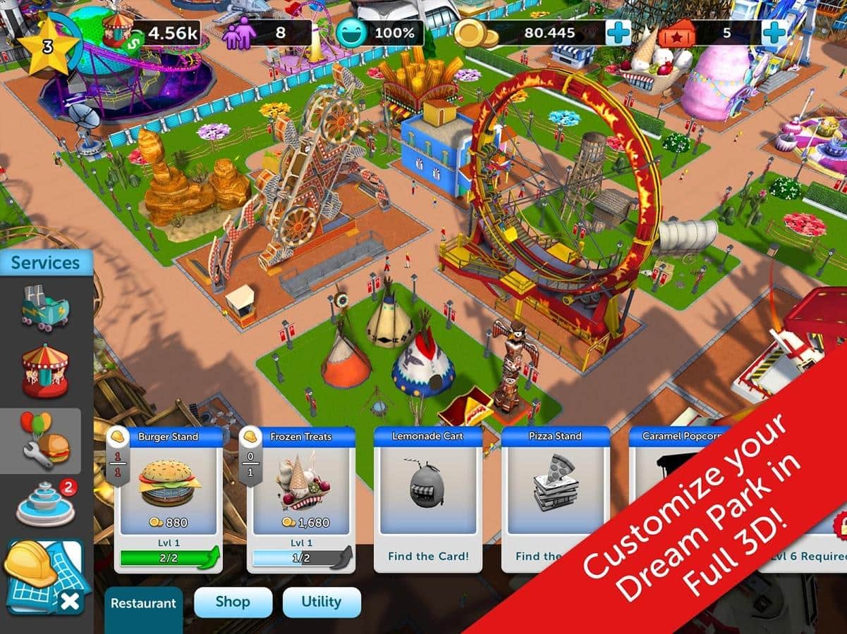 RollerCoaster Tycoon Touch - Отличная игра для любителей парков аттракционов! В этой игре вы сможете осуществить свою давнюю мечту. Построить свой собственный парк развлечений со своими любимыми аттракционами. Стройте и улучшайте все возможные горки, карусели и игровые комнаты. Увеличивайте вместимость парка и стройте все возможные удобства для посетителя, ведь довольный посетитель - это постоянный клиент, который сможет выложить не малую сумму денег на развлечения!