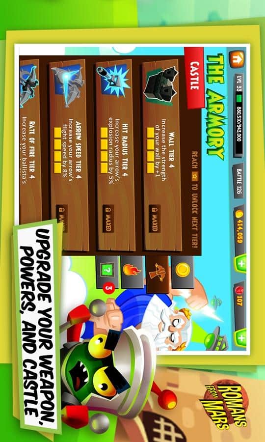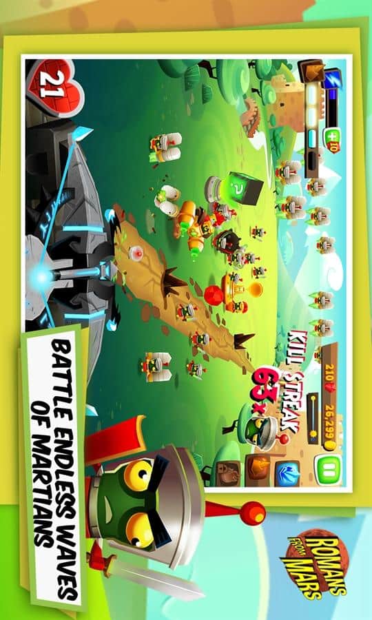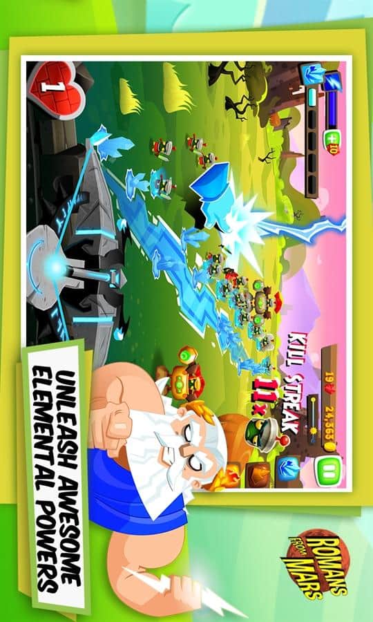 Romans From Mars - игра для windows phone, в которой по сюжету вы римский солдат, который препятствует вторжению марсиан на землю. К счастью, бог юпитер на стороне землян. Он помогает им различными стихиями (огнем, льдом, землей и светом). Пользуясь помощью могущественного бога, вы должны отбивать одну волну марсиан за другой и не дать захватить ваш последний бастион. В игре приятная 3D графика и увлекательный геймплей.