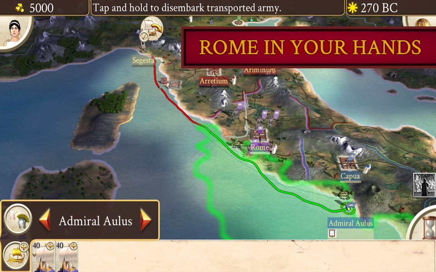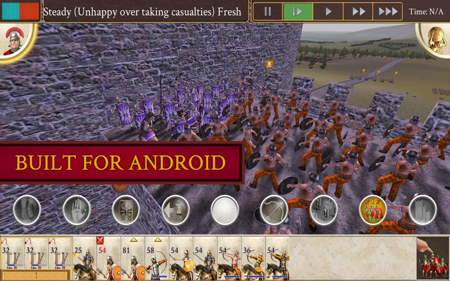 ROME: Total War – стратегическая компьютерная игра в которую вы сможете играть на андроид устройствах. Эта игра сочетает в себе пошаговую стратегию и тактику ведения боя в режиме реального времени. В этой игре вы будете править Древним миром, и завоевывать все новые территории, участвуя в захватывающих сражениях и невероятных военных компаниях. Управляйте огромными армиями и отдавайте им приказы в атаке и наступлении. Окажитесь на поле боя и управляйте тысячами войск, начиная от легионов, копейщиков и лучников и заканчивая кавалерией, колесницами и боевыми слонами.