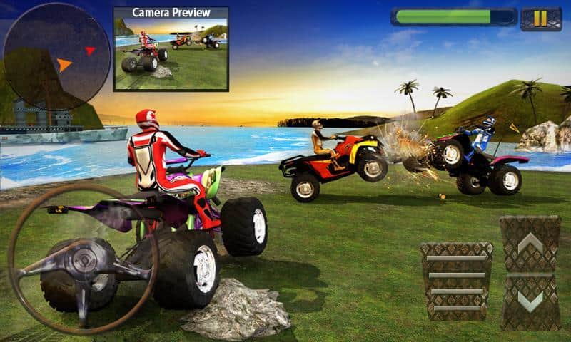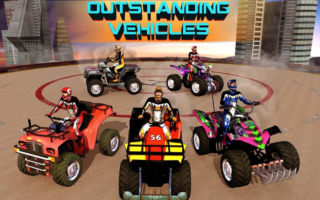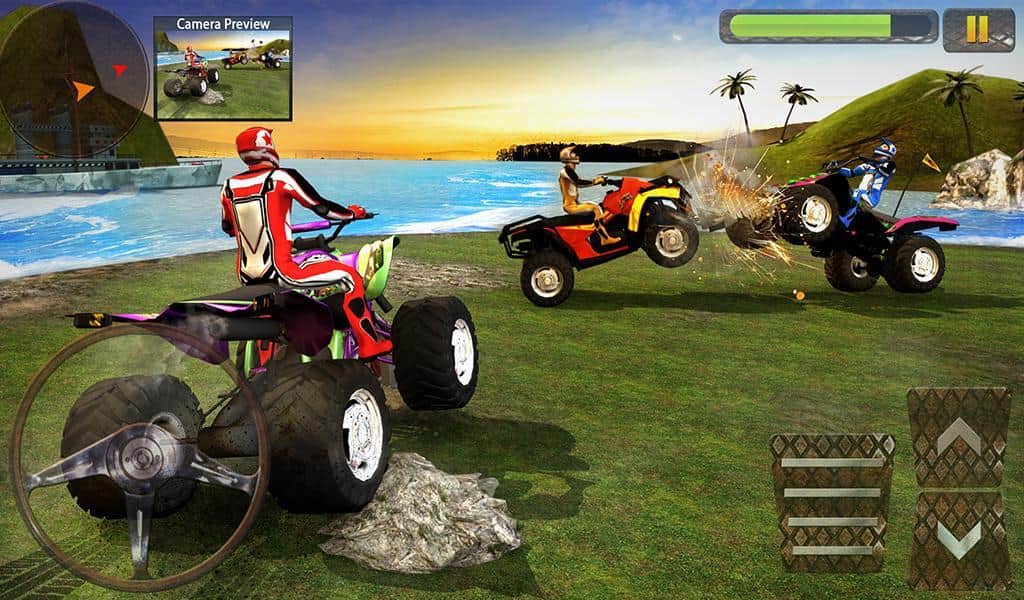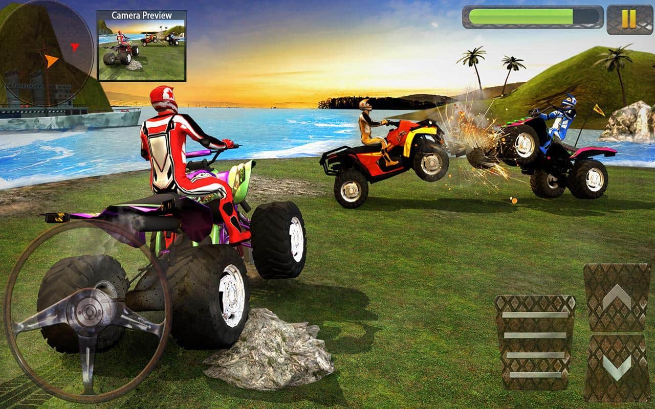 RoofTop Demolition Derby 3D – управляйте квадроциклом и примите свое участие в смертельно опасных заездах. В этой игре вы возьмете под свой контроль огромный квадроцикл и проведете его по различным трассам при этом, тараня соперника и стараясь выбросить его с поля или крыши. В этой игре вас порадует разнообразие локаций, которые будут находиться в различных местах, на крышах небоскребов, над обрывами с водой и лавой, сделайте все возможное, чтобы сбросить всех соперников и пройти удачно миссию. На огромной скорости тараньте своих соперников и разрушайте их квадроцикл пытаясь сбросить в бездну. После каждой удачно пройденной миссии приобретайте новые квадроциклы и начинайте все с начала.