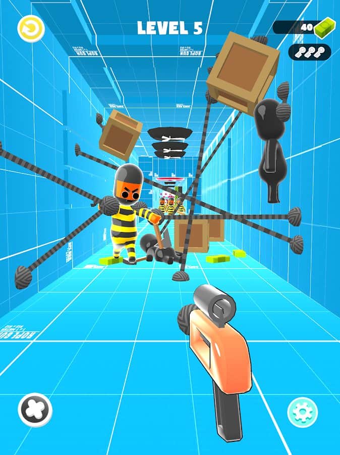 Rope Gun 3D - расчистите себе дорогу и уничтожьте всех противников специальным оружием, прикрепляющим предметы или другие вещи особыми веревками. Освободите заложников, стараясь не зацепить их во время боев, выберитесь вместе живыми. Дайте отпор всем атакам врагов и прилепите их к окружающей среде, сделанной специально под ваше оружие. Будьте осторожны: на пути вы встретите не только злых персонажей, но и множество других препятствий, которые необходимо будет убрать. Развлекайтесь и стреляйте в подходящие моменты!