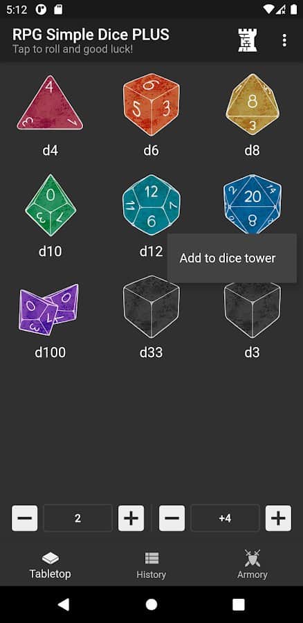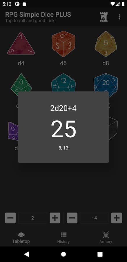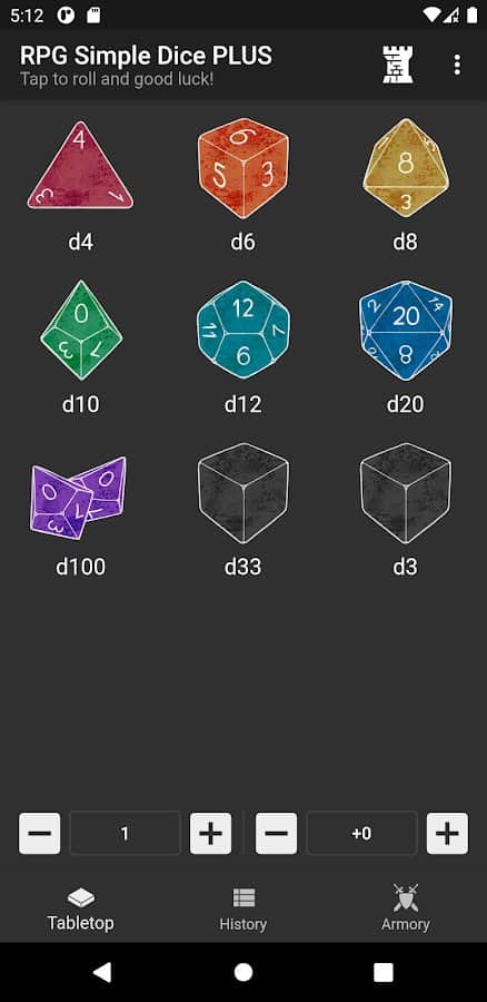 RPG Simple Dice - это самое обычное в использовании приложение для игры в кости для настольных ролевых игр. Сохраняйте свои рулоны, чтоб было легче играться, кидайте кубик большое количество раз, добавьте специальный модификатор, просматривайте истории бросков, бросайте множество кубиков одновременно, исследуйте классические и кастомные кубы. Настройте функционал под себя, хоть он и выглядит довольно простым. Для начала использования приложения вовсе не требуется инструкция, все довольно понятно и просто.