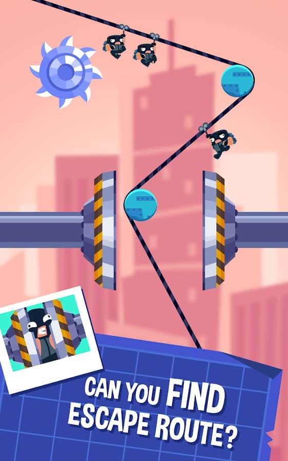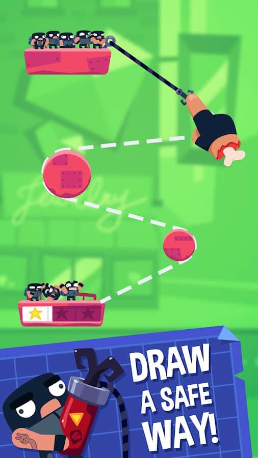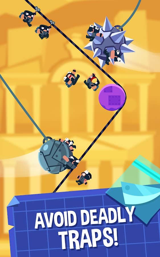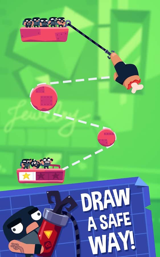 Rubber Robbers - Rope Escape – захватывающая головоломка на андроид, где вы будете помогать грабителям добраться до сейфа в банке. В этой игре вашей главной задачей будет проложить путь для грабителей, которые хотят ограбить банк. Проведите по экрану пальцем и нарисуйте линию по которой в дальнейшем будут двигаться грабители, обходя все преграды на пути. Спускайтесь в сокровищницу банка или ювелирного магазина и уносите свою добычу. Старайтесь переместить всех грабителей с одной платформы на другую ведь от них будет зависеть сколько сокровищ вы унесете. Играйте в эту игру и наслаждайтесь отличной графикой, увлекательным сюжетом и сложными головоломками.