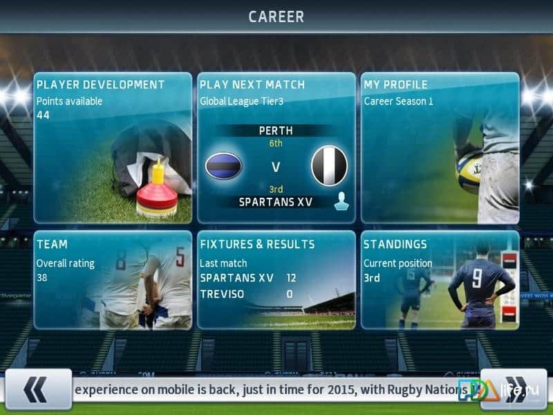 Rugby Nations 15 - Профессиональный регби для андроид. К вашему вниманию представляем игру с режимом карьеры. Сначала вы берете неизвестную команду и повышая свои навыки и характеристики, доводите команду до Международного Кубка Регби. Для этого у вас будут более 100 моделей игроков, суперсовременные стадионы, реальная графика игры и великолепное музыкальное сопровождение.