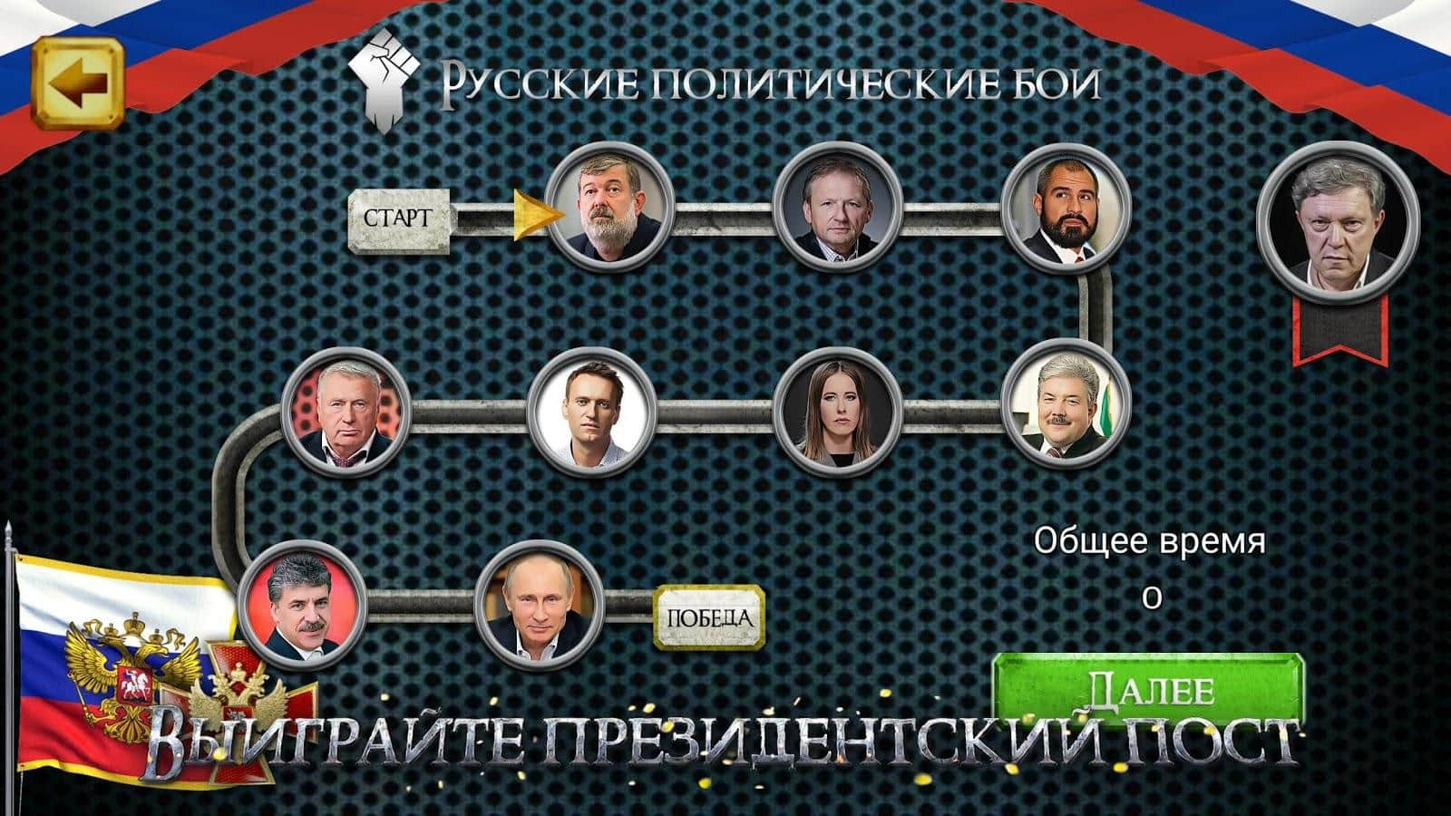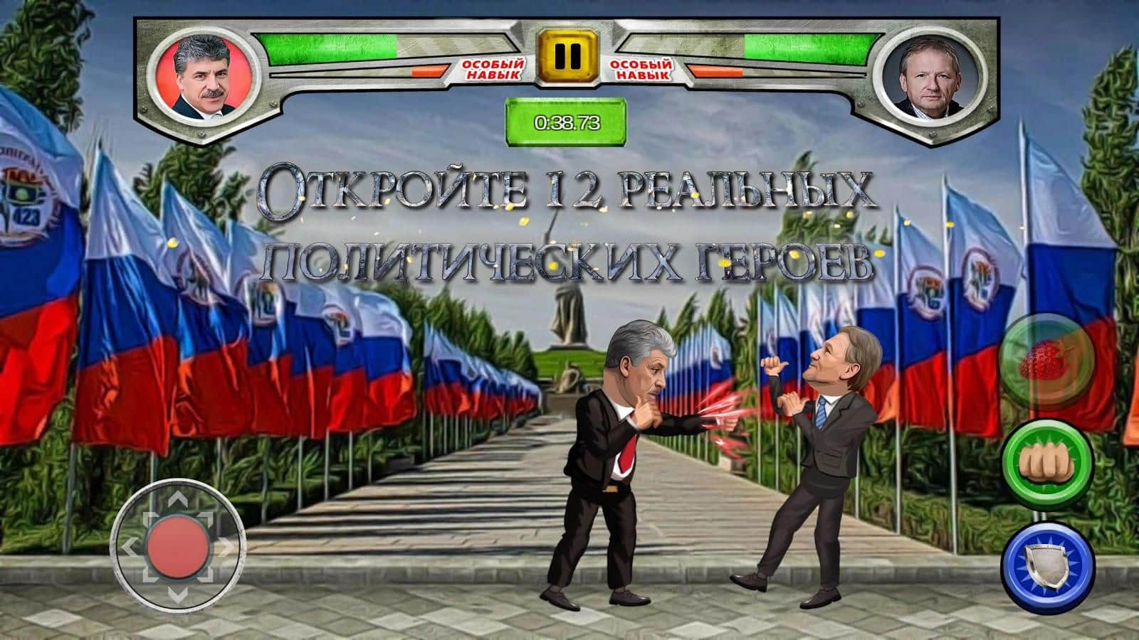 Русские политические бои – в этой игре вам предстоит окунуться в мир политики, дебатов... и мордобоя. На кануне президентских выборов на политической арене вы встретитесь с главными кандидатами на пост главы государства. Отстаивайте свою точку зрения, запаситесь аргументами и терпением. Познакомьтесь с 12 персонажами, прослушайте реальные выдержки из речей российских политиков, разработайте тактику поведения и внедряйте свою политическую кампанию. Вам даже будет доступен навык бросания фруктами и удар газовой трубой. Наслаждайтесь карикатурной графикой и получите массу удовольствия.