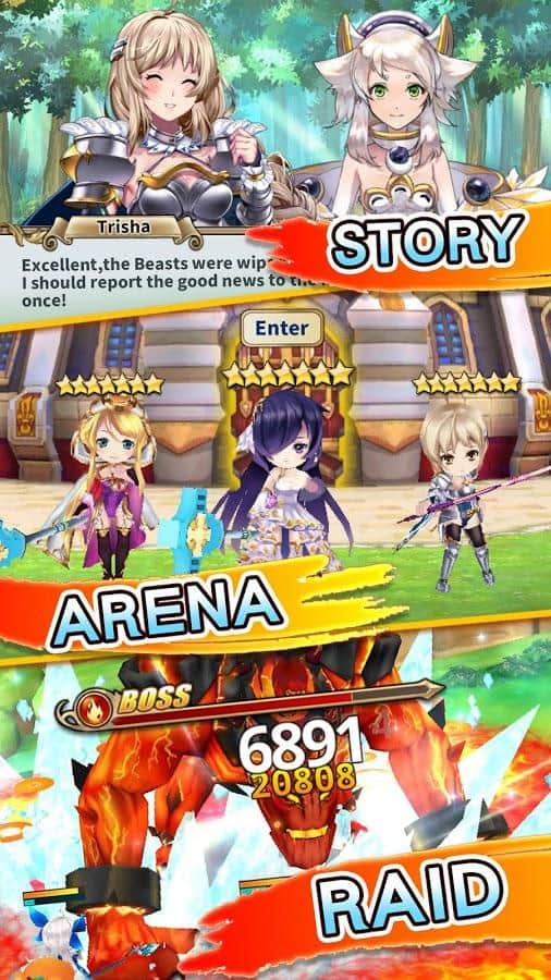 Sacred Sword Princesses – увлекательный экшен на андроид, где вы примите участие в спасении королевства Мидгардия. В этой игре вы перенесетесь в великолепные земли, созданные богиней Луны - Мани которые населены исключительно женщинами. Злая и властная хозяйка ночи стремиться поглотить и разрушить королевство Мидгардия. Вы были призваны богиней для того чтобы защитить и спасти земли королевства. Возьмите под свой контроль главную героиню и прокачивайте и улучшайте ее способности, чтобы открыть священную силу скрытую в вас. Всего в игре вы найдете 30 неповторимых и коллекционных персонажей которых вы сможете комбинировать между собой чтобы произвести нужные вам атаки. Настраивайте команду по своему усмотрению и бросайте вызов реальным игрокам со всего мира.