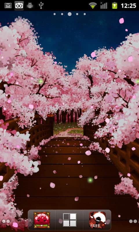 Sakura's Bridge Live Wallpaper – весенняя сакура на живых обоях для андроид устройств от разработчика GloveCat. Розовые лепестки будут слетать с деревьев аллеи, среди которых можно заметить пролетающего шмеля, ну а ночью шмелей сменят светлячки. Присутствующие настройки, помогут вам в определении скорости падения лепестков цветов и не только. Красиво и романтично.