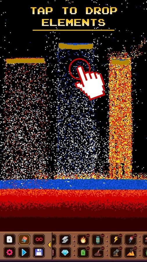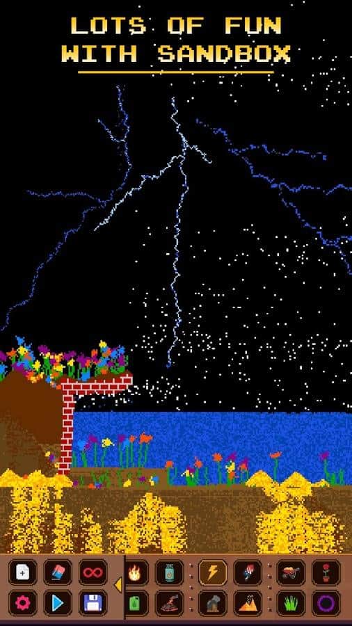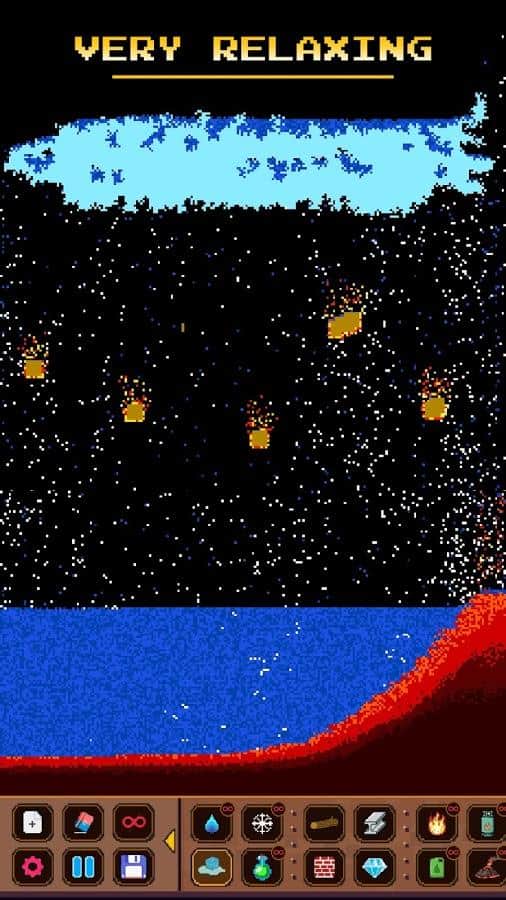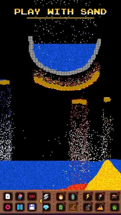 Sandbox - Physics Simulator - тренируйте свое эмоциональное состояние на выносливость с помощью песка. Спокойствие и гармония научит вас быть всегда расслабленным. Создайте свой собственный пиксельный мир, используя текстуры и просто разноцветные песчинки. Наблюдайте за замечательными химическими реакциями (создание огня, света, дождя, взрыва, молнии и эффекты при кипении воды), нажимайте на песок для его прыжка, играйтесь любыми способами, создавайте что-то новое и сразу же разрушайте. Экспериментируйте и управляйте этим миром как хотите!