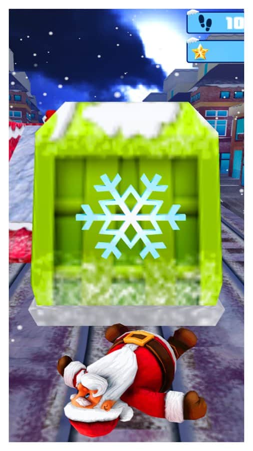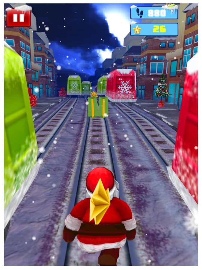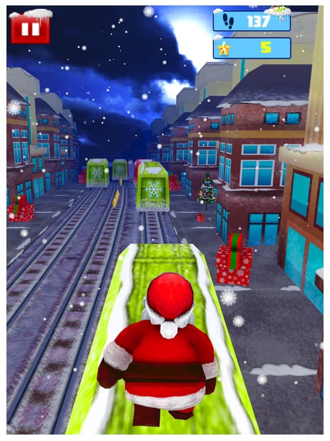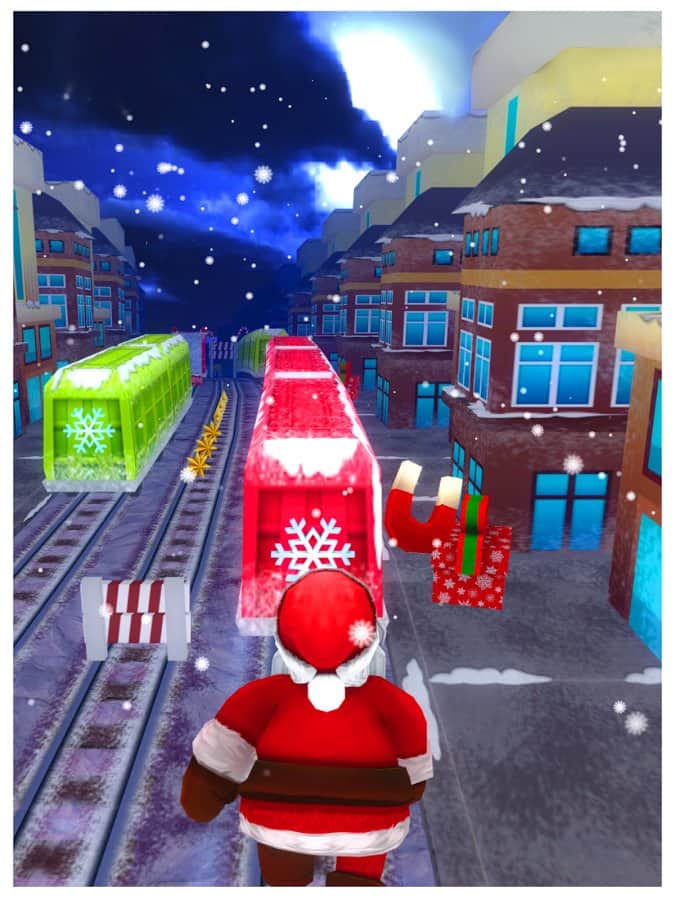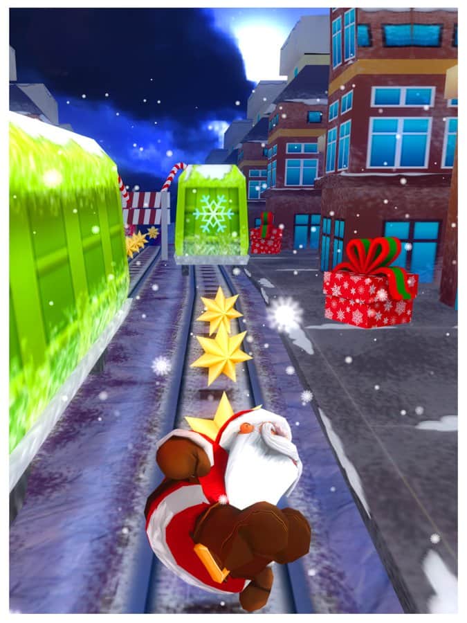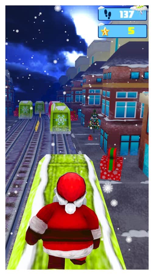 Santa Runner :Xmas Subway Surf – раннер на андроид, который подарит вам новогоднее настроение. В этой игре вашей главной задачей будет провести Санта Клауса по многочисленным уровням и собрать все подарки. Бегайте, прыгайте и обходите все многочисленные вагоны, которые окажутся у вас на пути, чтобы как можно быстрее набрать свой мешок подарками. Также не забывайте собирать золотые звезды и бонусы в виде реактивного ранца и магнита. Устанавливайте свой рекорд в этой игре и открывайте новые трассы. Наслаждайтесь новогодней атмосферой игры и ждите приближение праздников.