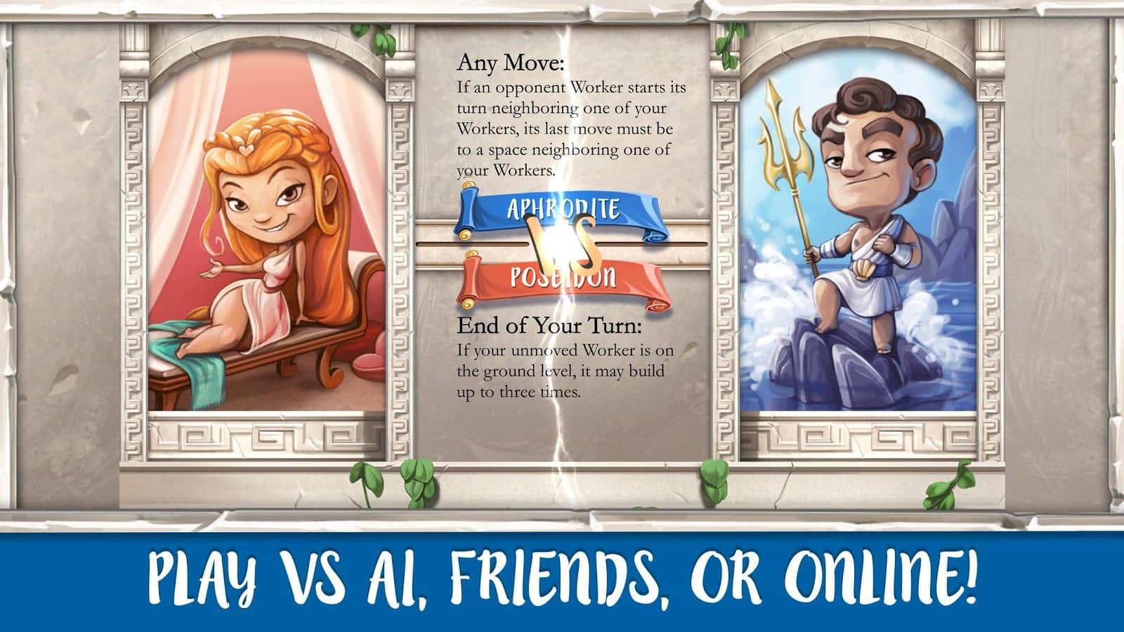 Весьма оригинальная настольная игра, с приятной 3D игровой зоной и красивой визуальной составляющей на тему мифологии древней Греции. В игре три режима, online, local и odissey (одиночный режим). Геймплей довольно неторопливый и может слегка наскучить тем кто не привык, но любителям подобного жанра советую.