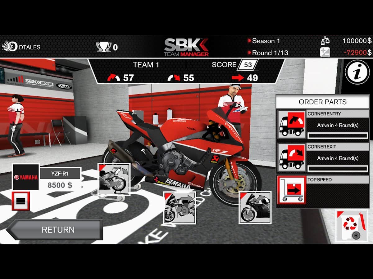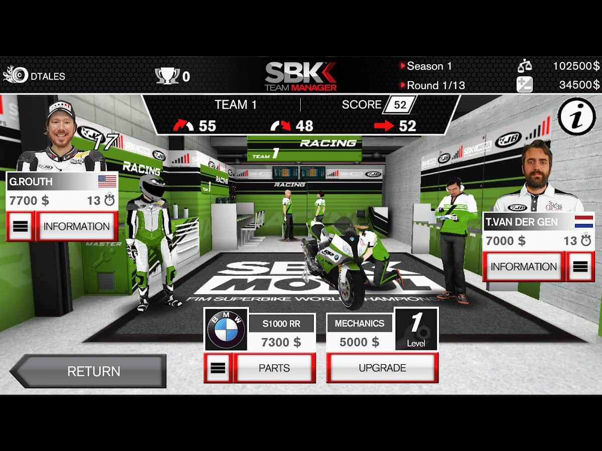 SBK Team Manager – отличный симулятор на андроид, где вы будете управлять спортивным байком. Соберите себе команду опытных гонщиков и примите участие в чемпионате мира Motul FIM Superbike. Создайте непобедимую команду и подбирайте для нее самые скоростные мотоциклы, которые покажут лучшие результаты на трассах. Обновите, протестируйте и настройте свой мотоцикл по своему усмотрению и наклейте на него логотипы спонсоров. Получайте отличные призы и открывайте для себя новые мотоциклы. Наблюдайте за своим мотоциклом через динамичные камеры и резко обгоняйте противников. Будьте предельно осторожны и внимательны, чтобы не сойти с трассы и учитывайте при этом погодные условия.