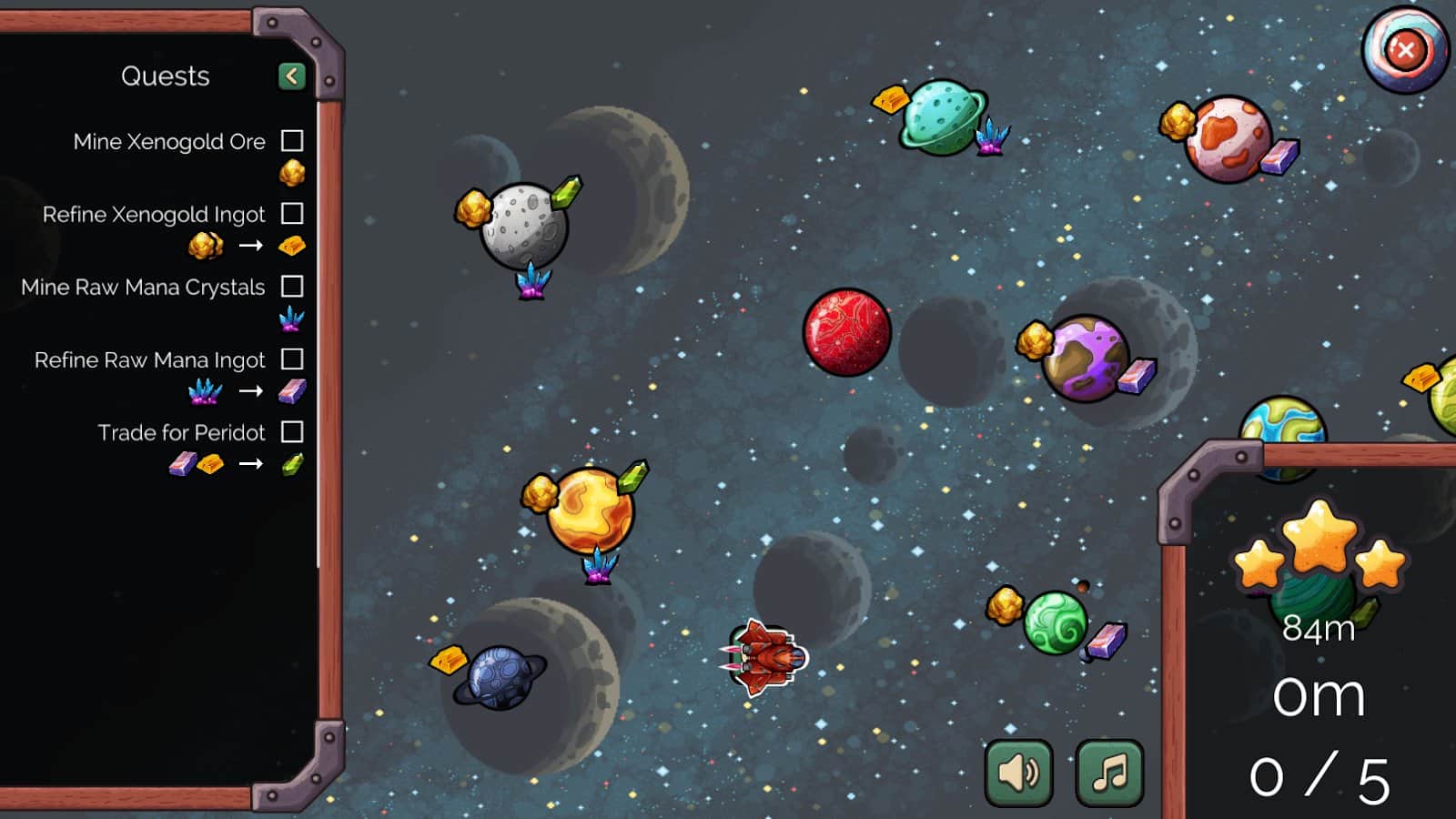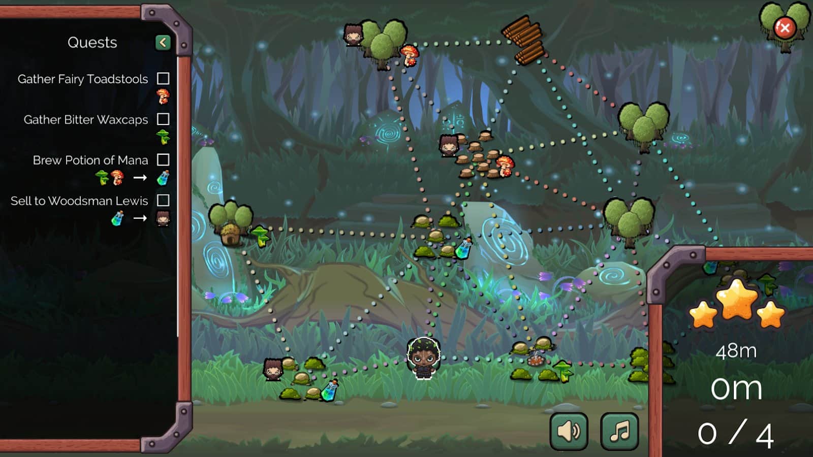 Сбор Aлхимика - Попробуйте решить головоломки в виде путей, доступные для прохождения миссий. В меню слева вам даются задания, а справа написано количество метров для самого удачного прохода. Продумывайте стратегии для максимально выгодного перемещения и старайтесь не превышать лимит в дистанции, чтобы получить все звезды за уровень. На каждой локации находятся определенные предметы, вы же алхимик, поэтому вам важно добраться ко всем ресурсам. Путешествуйте по планетам, создавайте магические зелья и торгуйте на рынке.