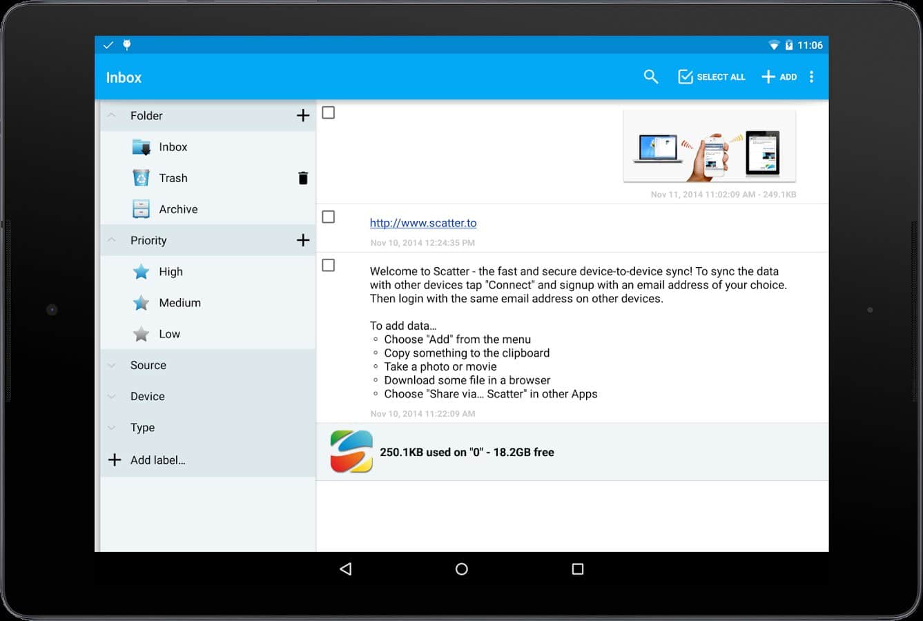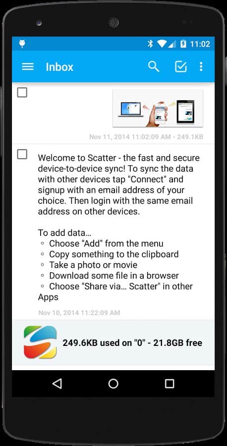 Scatter – хорошая программа для обмена файлами между вашим андроид устройством и ПК. Все что от вас требуется – это скачать и установить данное приложение на свой смартфон/планшет, установить клиент для ПК, завести аккаунт, а дальше после появления пиринговой сети, вы с легкостью приступаете к обмену файлами. Простой в использовании, быстрый и безопасный способ передачи данных. Приятной работы!