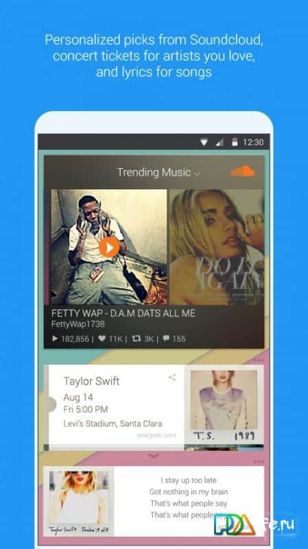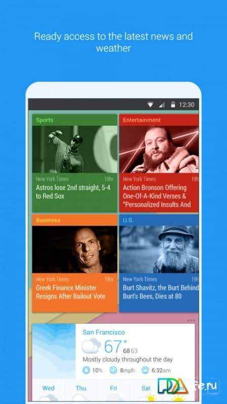 Внешне приложение оформлено просто и аккуратно: над док-баром располагаются тематические плитки, на которые выводится интересующая вас информация: видео на YouTube, популярные треки из Sound Cloud, свежие новости и, конечно же, погода. Прямо с домашнего экрана можно воспользоваться сервисом Uber или подыскать интересующие развлечения.